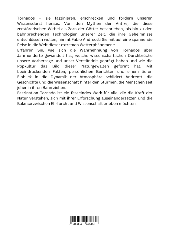 Tornados - sie faszinieren, erschrecken und fordern unseren Wissensdurst heraus. Von den Mythen der Antike, die diese zerstörerischen Wirbel als Zorn der Götter beschrieben, bis hin zu den bahnbrechenden Technologien unserer Zeit, die ihre Geheimnisse entschlüsseln wollen, nimmt Fabio Andreotti Sie mit auf eine spannende Reise in die Welt dieser extremen Wetterphänomene.Erfahren Sie, wie sich die Wahrnehmung von Tornados über Jahrhunderte gewandelt hat, welche wissenschaftlichen Durchbrüche unsere Vorhersage und unser Verständnis geprägt haben und wie die Popkultur das Bild dieser Naturgewalten geformt hat. Mit beeindruckenden Fakten, persönlichen Berichten und einem tiefen Einblick in die Dynamik der Atmosphäre schildert Andreotti die Geschichte und die Wissenschaft hinter den Stürmen, die Menschen seit jeher in ihren Bann ziehen.Faszination Tornado ist ein fesselndes Werk für alle, die die Kraft der Natur verstehen, sich mit ihrer Erforschung auseinandersetzen und die Balance zwischen Ehrfurcht und Wissenschaft erleben möchten.