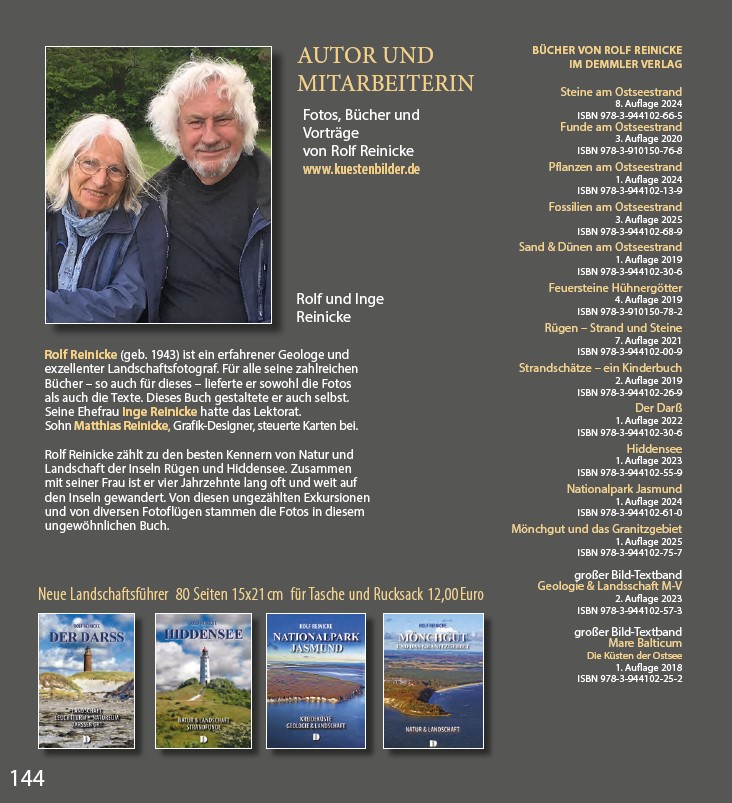 Der Diplom-Geologe Rolf Reinicke (geb. 1943) ist ein bekannter Landschaftsfotograf und erfolgreicher Buchautor – Bestsellerautor unseres Verlages. Er lebt an der Ostsee und hat ihre Küsten und Inseln in langen Jahren selbst entdeckt, erlebt und fotografiert. Von ihm stammen alle Texte und Fotos. Viele Titel entstanden in enger Zusammenarbeit mit seinem Sohn Matthias (Buchgestalter, Grafik-Designer) und seiner Ehefrau Inge.