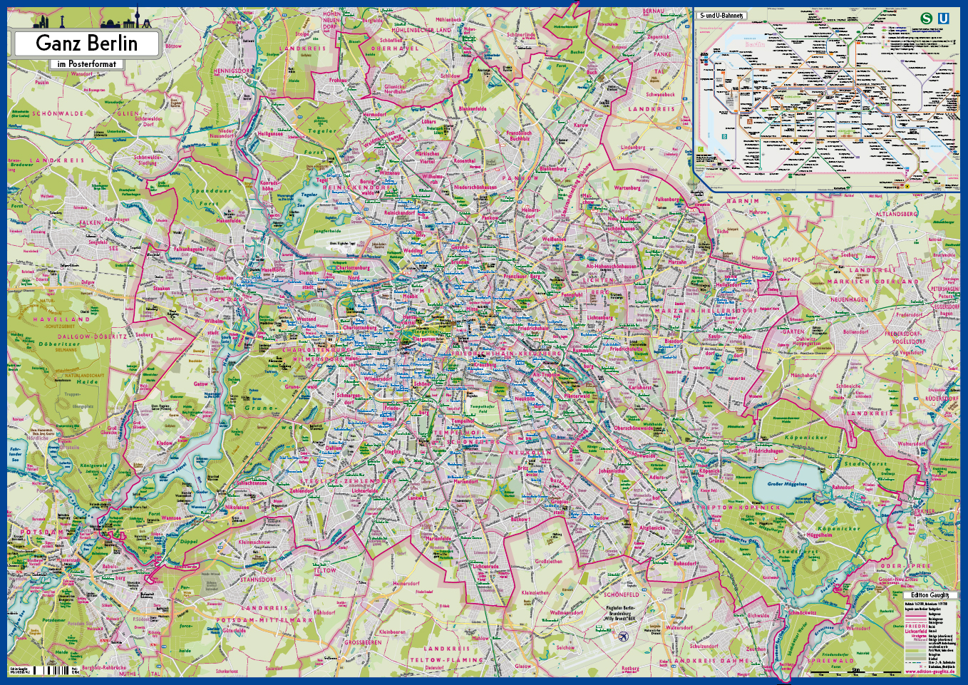 Plan vom gesamten Berlin Stadtgebiet im Maßstab 1 : 63 500. Kartenformat 84 x 59 cm (auf DIN A4 gefaltet in Cellophanhülle). Rückseite unbedruckt. Ebenfalls noch im Kartenbereich: Potsdamer Innenstadt mit Park Sanssouci, Flughafen BER und Berliner Umland. Mit S- und U-Bahnnetzplan. Betonung der Berliner Ortsteile mit Namen und Grenzen. Betonung der S- und U-Bahn und ihren Bahnhofsnamen. Straßenbahnlinien. Stadtstruktur mit allen Straßen, davon die wichtigsten Hauptstraßen mit Namen bezeichnet. Wohn- und Gewerbegebiete farblich unterschieden. Eintrag vieler Ortslagen und Siedlungen sowie Gewässer, Wälder und Landmarken. Höhenangaben der natürlichen und künstlichen Erhebungen.