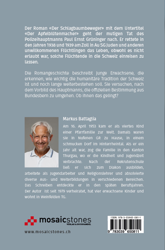 Am 16. April 1953 kam Markus Battaglia als viertes Kind einer Pfarrfamilie zur Welt. Damals waren sie in Nufenen GR zu Hause, in einem schmucken Dorf im Hinterrheintal. Als er ein Jahr alt war, zog die Familie in den Kanton Thurgau, wo er die Kindheit und Jugendzeit verbrachte. Nach der Rektrutenschule ließ er sich zum Diakon ausbilden, arbeitete als Jugendarbeiter und Religionslehrer und absolvierte diverse Aus- und Weiterbildungen in verschiedenen Bereichen. Das Schreiben entdeckte der Autor in den späten Berufsjahren. Seit 1981 ist er verheiratet, hat vier erwachsene Kinder und wohnt in Weinfelden TG.