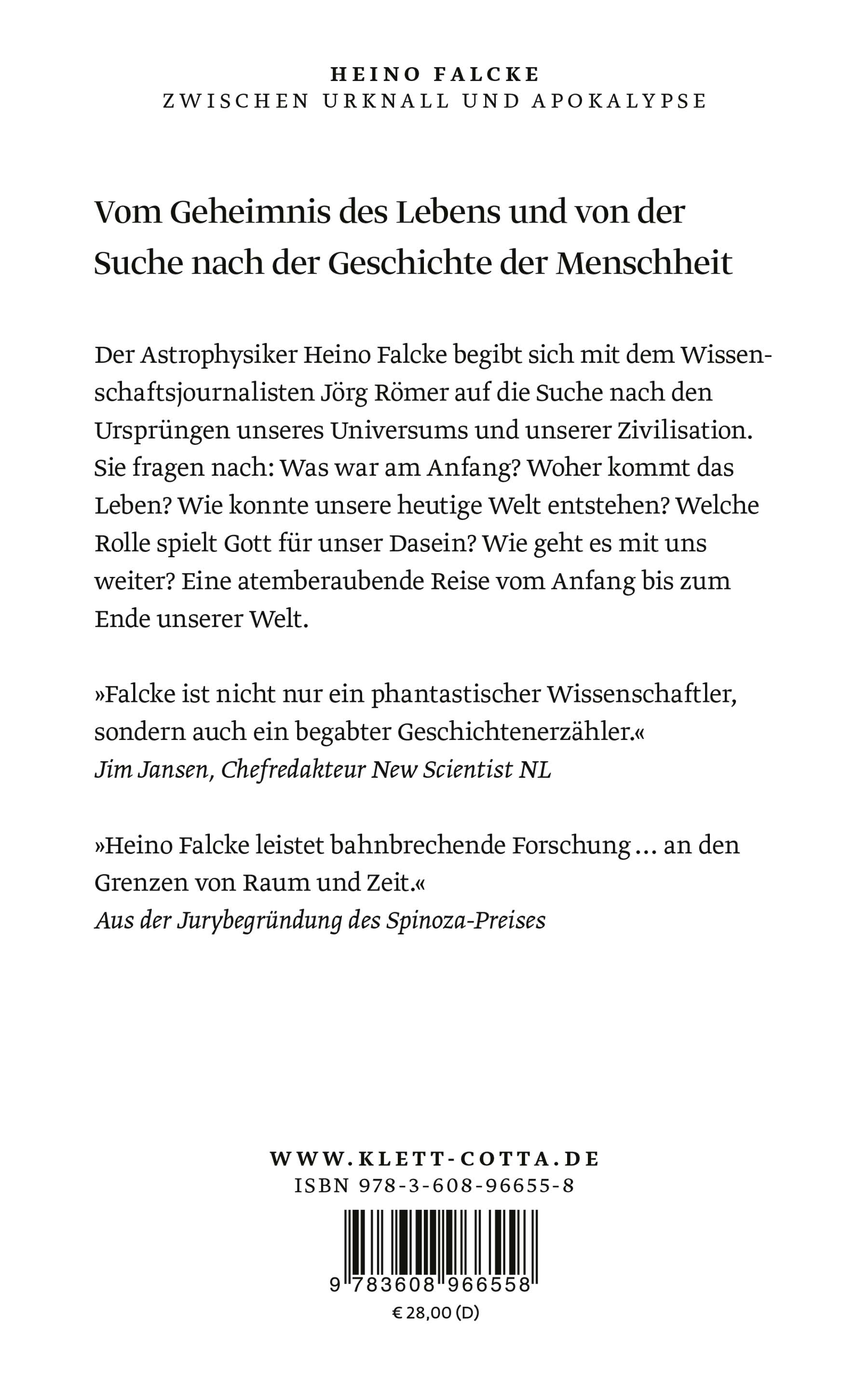 Der Astrophysiker Heino Falcke begibt sich mit dem Wissenschaftsjournalisten Jörg Römer auf die Suche nach den Ursprüngen unseres Universums und unserer Zivilisation. Sie fragen nach: Was war am Anfang? Woher kommt das Leben? Wie konnte unsere heutige Welt entstehen? Welche Rolle spielt Gott für unser Dasein? Wie geht es mit uns weiter? Eine atemberaubende Reise vom Anfang bis zum Ende unserer Welt.