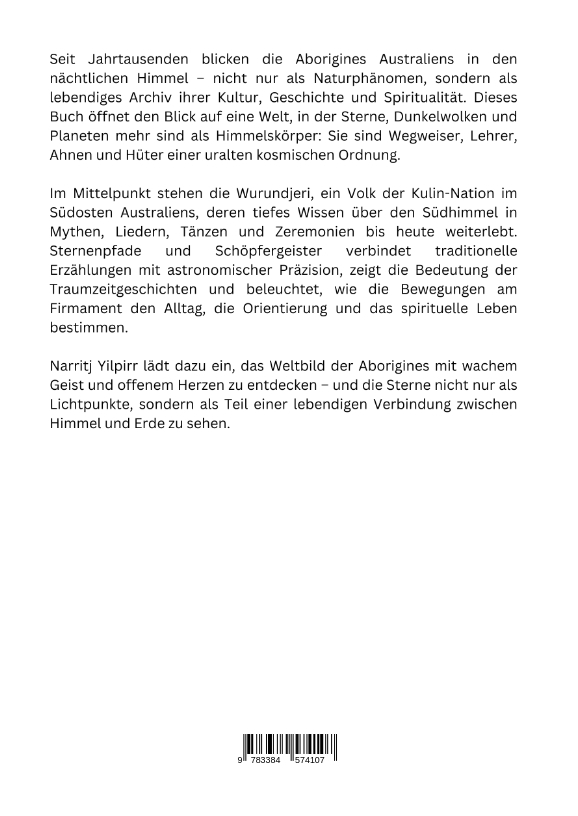 Seit Jahrtausenden blicken die Aborigines Australiens in den nächtlichen Himmel - nicht nur als Naturphänomen, sondern als lebendiges Archiv ihrer Kultur, Geschichte und Spiritualität. Dieses Buch öffnet den Blick auf eine Welt, in der Sterne, Dunkelwolken und Planeten mehr sind als Himmelskörper: Sie sind Wegweiser, Lehrer, Ahnen und Hüter einer uralten kosmischen Ordnung.Im Mittelpunkt stehen die Wurundjeri, ein Volk der Kulin-Nation im Südosten Australiens, deren tiefes Wissen über den Südhimmel in Mythen, Liedern, Tänzen und Zeremonien bis heute weiterlebt. Sternenpfade und Schöpfergeister verbindet traditionelle Erzählungen mit astronomischer Präzision, zeigt die Bedeutung der Traumzeitgeschichten und beleuchtet, wie die Bewegungen am Firmament den Alltag, die Orientierung und das spirituelle Leben bestimmen.Narritj Yilpirr lädt dazu ein, das Weltbild der Aborigines mit wachem Geist und offenem Herzen zu entdecken - und die Sterne nicht nur als Lichtpunkte, sondern als Teil einer lebendigen Verbindung zwischen Himmel und Erde zu sehen.