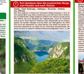 Die Motorradkarte stellt 13 Tourenvorschläge von 150 bis 250 km Länge in Norditalien vor. Sie führen durch die Dolomiten vom Trentino im Westen bis zum Friaul im Osten der Südtiroler Alpen. Zu bewältigen sind kurvenreiche Passstraßen, die den erfahrenen Biker bis auf max. 2033 m ü. NN führen. Belohnt wird er mit Ausblicken auf die Berggipfel, die italienische Tiefebene und den Gardasee. Weitere Touren führen um den Gardasee mit seinen engen Uferstraßen und in die Lagunenstadt Venedig mit seinen Kanälen, seiner Rialtobrücke oder dem Dom am Markusplatz. Auf der Rückseite der Motorradkarte finden sich ausführliche ausschließlich deutschsprachige Informationen zu den Strecken.