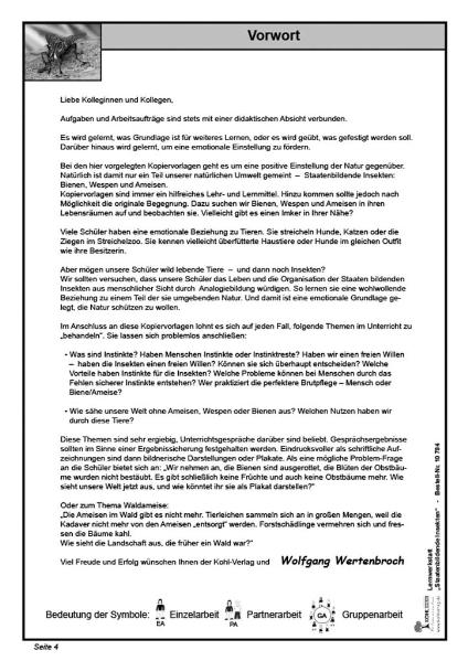 Was ist ein staatenbildendes Insekt?; Der Bienenstock; Arbeiterin; Drohne und Königin; Verschiedene Bienenarten; Die Wespe; Wie Wespen leben; Die Ameise; Der Ameisenhügel; Ameisen im Wald; Das Leben der Ameisen; Wanderameisen; Mit Lösungen zur Selbstkontrolle; 36 Kopiervorlagen