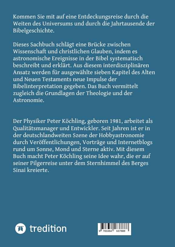 Der Physiker Peter Köchling, geboren 1981, arbeitet als Qualitätsmanager und Entwickler. Seine Passion seit Kindheit an ist die Astronomie. Seit Jahren ist er in der deutschlandweiten Szene der Hobbyastronomen aktiv durch Veröffentlichungen, Vorträge und Internetblogs rund um Sonne, Mond und Sterne. Mit diesem Buch macht Peter Köchling eine Idee wahr, die er auf einer Pilgerreise unter dem Sternhimmel des Berges Sinai kreierte.