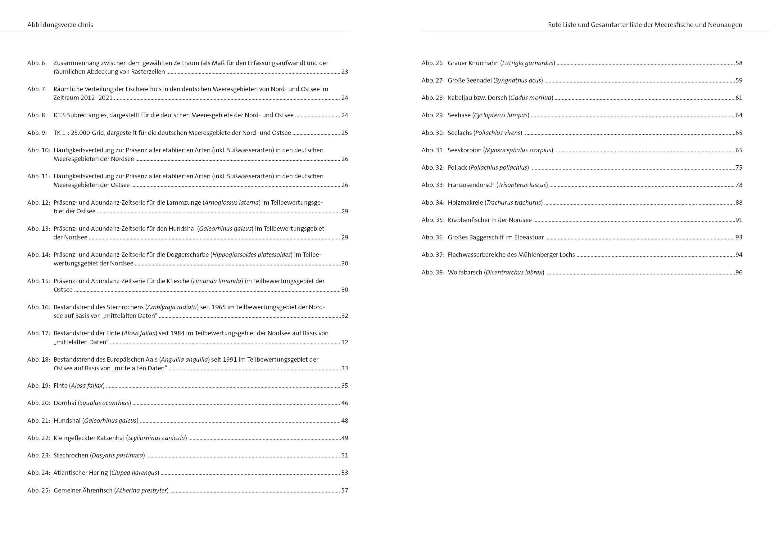 12 Jahre nach dem Erscheinen der Vorgängerfassung von 2013 liegt eine aktualisierte Rote Liste der Meeresfische und Neunaugen Deutschlands vor. Sie gibt in differenzierter Form Auskunft über unsere wildlebenden Arten der Meeresfische und Neunaugen und ihre Gefährdungssituation. Dabei werden nicht nur die in ihrem Bestand bedrohten Arten behandelt. Die Gesamtartenliste enthält 105 in Deutschland etablierte Meeresfischarten, die bewertet werden.