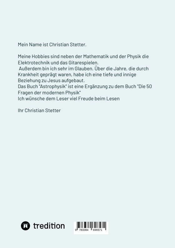 In meinem Buch erläutere ich dem Leser die Materie der "Astrophysik". Mein Buch ist geeignet für Physikaffine Personen.Ich erläutere dem Leser anhand von Text und Formeln das Thema "Astrophysik". Das vorliegende Buch ist eine gute Ergänzung zu dem Buch "Die 50 Fragen der modernen Physik"