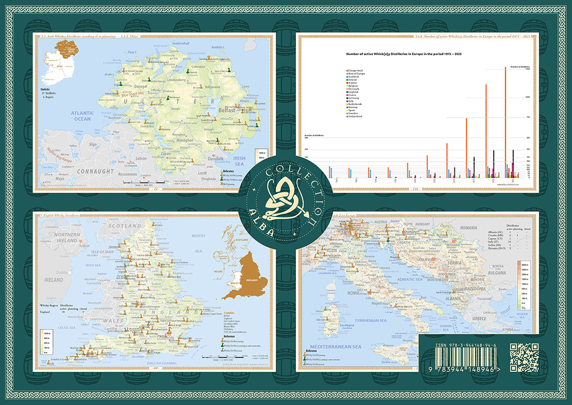 46 Regionalkarten, ein Stadtplan von Campbeltown (in der Vergangenheit mit über 30 lokalen Destillerien die Whisky-Hauptstadt der Welt), sechs Übersichtskarten und zwei Grafiken helfen bei der Orientierung und machen die Erfolgsgeschichte des Whisk(e)ys in ganz Europa visuell sichtbar.