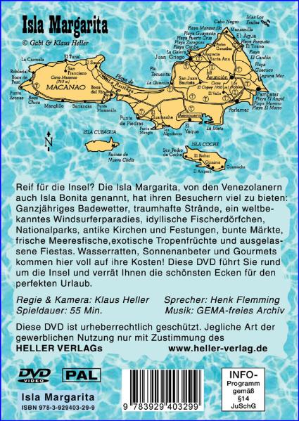Reif für die Insel? Die Isla Margarita, von den Venezolanern auch Isla Bonita genannt, hat ihren Besuchern viel zu bieten: Ganzjähriges Badewetter, traumhafte Strände, ein weltbekanntes Windsurferparadies, idyllische Fischerdörfchen, Nationalparks, antike Kirchen und Festungen, bunte Märkte, frische Meeresfische, exotische Tropenfrüchte und ausgelassene Fiestas. Wasserratten, Sonnenanbeter und Gourmets kommen hier voll auf ihre Kosten! Diese DVD führt Sie rund um die Insel und verrät Ihnen die schönsten Ecken für den perfekten Urlaub.DVD / PAL / 55 Min. / Copyright by HELLER VERLAG