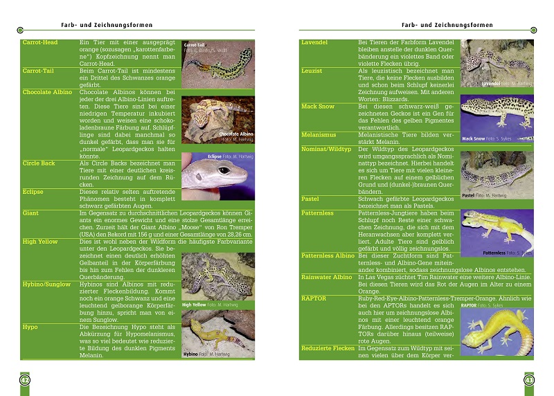 VorwortBeschreibungVerbreitung und natürlicher LebensraumLebensweiseGesetzliche Bestimmungen und ErwerbTransport und QuarantäneTerrarium und TechnikDie TerrarieneinrichtungPflege und ErnährungWinterruheVermehrungAufzucht der JungtiereFarb- und ZeichnungsformenGrundzüge der VererbungslehreKrankheitenVergesellschaftungWeitere InformationenDankVerwendete und weiterführende Literatur
