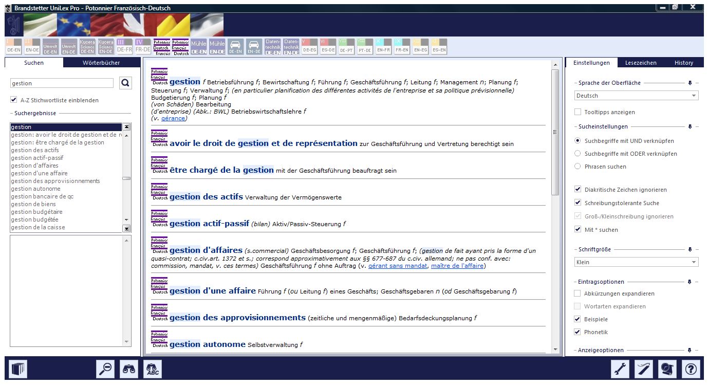Der Potonnier ist seit Erscheinen der ersten Auflage vor 50 Jahren zu einem Standardwerk auf seinem Gebiet geworden und zu einem unverzichtbaren Arbeitsmittel für jeden, der mit der französischen Sprache auf hohem Niveau arbeitet.Die CD-ROM/Download-Ausgabe enthält die Printausgaben:- Deutsch-Französisch 4. Auflage 2008- Französisch-Deutsch 4. Auflage 2014mit insgesamt rund 190.000 Stichwörtern.Der Potonnier bietet den aktuellen Wortschatz aus nahezu allen wichtigen Bereichen der Wirtschaft, des Rechts und des Handels (unter anderem Arbeitsrecht, Außenhandel, Bank- und Börsenwesen, Betriebswirtschaft, Familienrecht, Finanzwesen, Gerichtsbarkeit, Güterverkehr, Handelsrecht, Insolvenzverfahren, Patentwesen, Privat- und Sozialversicherung, Sozialrecht, Steuerwesen, Strafrecht, Verkehrsrecht, Vertragswesen, Verwaltungsrecht, Zivilrecht, Zollwesen).Das wesentliche Charakteristikum dieses Werkes ist die Bereitstellung von zusätzlichem Informationsmaterial (z.B. Verweise auf sachverwandte Begriffe und auf Gesetzbücher, rechtsvergleichende Hinweise, kurze Erläuterungen und Definitionen, Synonyme, Antonyme, Wortverbindungen, Anwendungsbeispiele), das dem Übersetzer eine große Hilfe sein wird, dem oft die Zeit oder die Möglichkeit zu eigenen umfangreichen Nachforschungen in der einschlägigen Fachliteratur fehlt.Das Wörterbuch erscheint unter der neuen UniLex Pro - Oberfläche:- schnelle und komfortable Suche nach Stichwörtern, Zusammensetzungen und im Volltext- UniLex Pro QuickSearch!, die konfigurierbare Pop-up-Funktion zur Suche in beliebigen Anwendungen- Lesezeichen und Historyfunktion- Eigene Benutzerwörterbücher anlegen mit UniTerm Light und direkt nutzen in UniLex Pro.- Netzwerklizenzen auf Anfrage