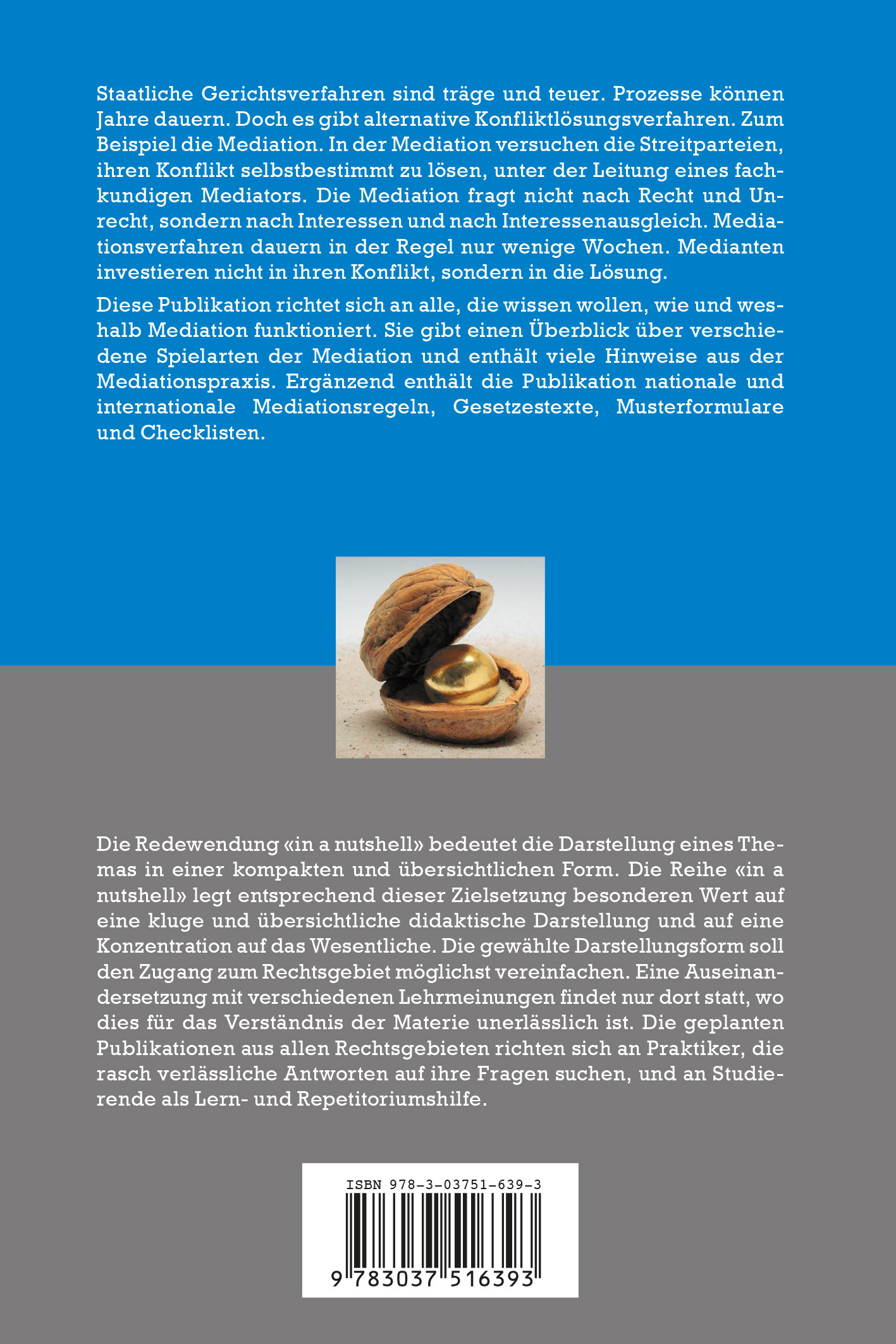 Staatliche Gerichtsverfahren sind träge und teuer. Prozesse können Jahre dauern. Doch es gibt alternative Konfliktlösungsverfahren. Zum Beispiel die Mediation. In der Mediation versuchen die Streitparteien, ihren Konflikt selbstbestimmt zu lösen, unter der Leitung eines fachkundigen Mediators. Die Mediation fragt nicht nach Recht und Unrecht, sondern nach Interessen und nach Interessenausgleich. Mediationsverfahren dauern in der Regel nur wenige Wochen. Medianten investieren nicht in ihren Konflikt, sondern in die Lösung. Diese 'nutshell' - Publikation richtet sich an alle, die wissen wollen, wie und weshalb Mediation funktioniert. Sie gibt einen Überblick über verschiedene Spielarten der Mediation und enthält viele Hinweise aus der Mediationspraxis. Ergänzend enthält die Publikation nationale und internationale Mediationsregeln, Gesetzestexte, Musterformulare und Checklisten.