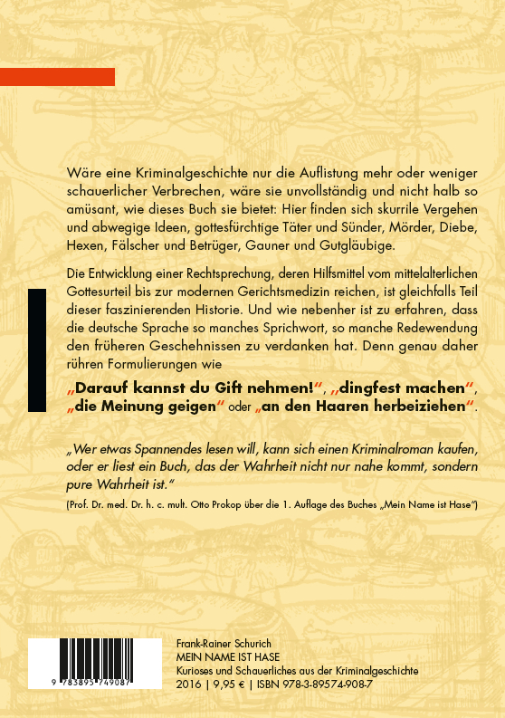 "Schurich listet jede Menge Übles, aber auch Kurioses der letzten Jahrhunderte über Mörder, Diebe, Fälscher, Hexen, Gauner und Betrüger auf. Gleichzeitig dokumentiert Schurich auch die Entwicklung der Rechtsprechung. Vom mittelalterlichen Gottesurteil bis hin zur modernen Gerichtsbarkeit und Gerichtsmedizin."
