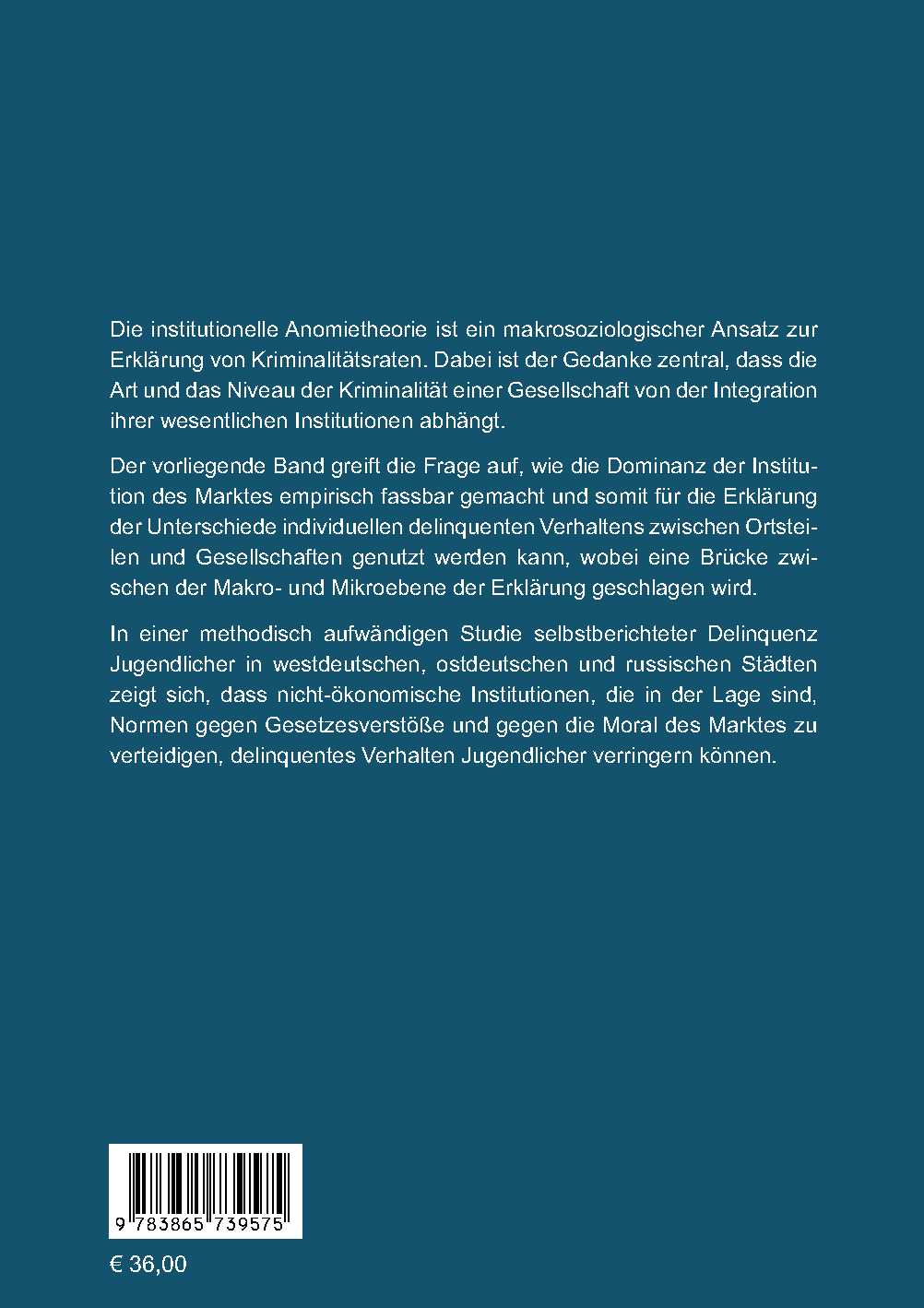 Der vorliegende Band greift die Frage auf, wie die Dominanz der Institution des Marktes empirisch fassbar gemacht und somit für die Erklärung der Unterschiede individuellen delinquenten Verhaltens zwischen Ortsteilen und Gesellschaften genutzt werden kann, wobei eine Brücke zwischen der Makro- und Mikroebene der Erklärung geschlagen wird.