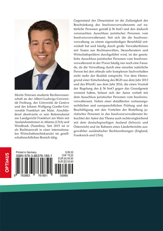 Gegenstand der Dissertation ist die Zulässigkeit der Beschränkung des Insolvenzverwalteramts auf natürliche Personen gemäß § 56 InsO und den dadurch verursachten Ausschluss juristischer Personen vom Insolvenzverwalteramt. Seit sich die die Insolvenzverwaltung zu einem eigenständigen Berufsbild entwickelt hat und häufig durch große Verwalterfirmen mit Teams aus Rechtsanwälten, Steuerberatern und Wirtschaftsprüfern durchgeführt wird, ist der gesetzliche Ausschluss juristischer Personen vom Insolvenzverwalteramt in der Praxis häufig nur noch eine Fassade, da die Verwaltung durch eine einzelne natürliche Person bei den oftmals sehr komplexen Sachverhalten nicht mehr der Realität entspricht. Vor dem Hintergrund einer Entscheidung des BGH aus dem Jahr 2013 und des BVerfG aus dem Jahr 2016, die einen Verstoß der Regelung des § 56 InsO gegen das Grundgesetz verneint haben, befasst sich der Autor vertieft mit dem Ausschluss juristischer Personen vom Insolvenzverwalteramt. Neben einer detaillierten verfassungsrechtlichen und europarechtlichen Prüfung und der Beschäftigung mit den Vorteilen der Bestellung juristischer Personen in das Insolvenzverwalteramt beleuchtet der Autor das Thema auch rechtsvergleichend mit dem deutschsprachigen Ausland (Schweiz und Österreich) und im Rahmen eines Länderberichts ausgewählter ausländischer Rechtsordnungen (England, Frankreich und USA).