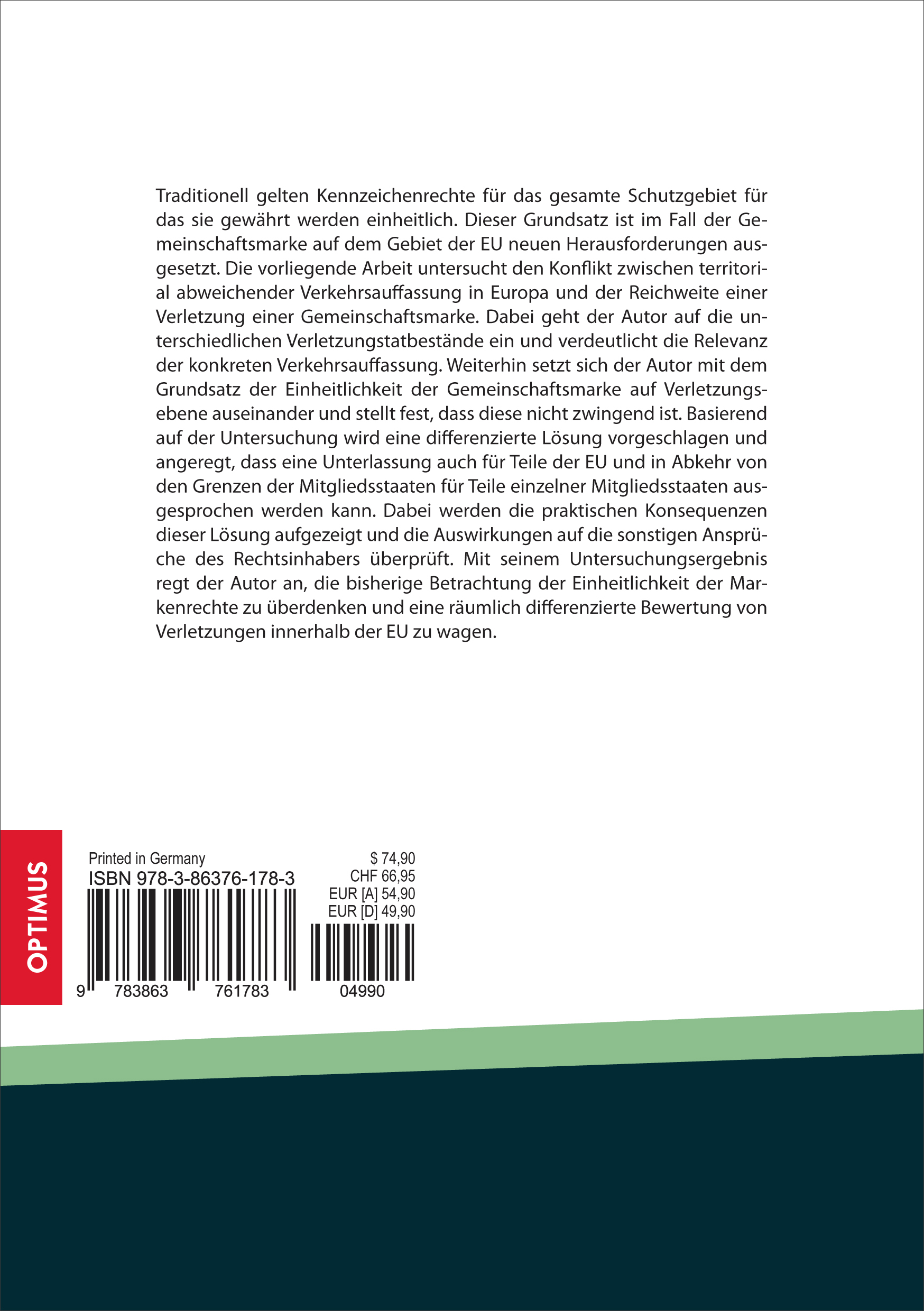 Traditionell gelten Kennzeichenrechte für das gesamte Schutzgebiet für das sie gewährt werden einheitlich. Dieser Grundsatz ist im Fall der Gemeinschaftsmarke auf dem Gebiet der EU neuen Herausforderungen ausgesetzt. Die vorliegende Arbeit untersucht den Konflikt zwischen territorial abweichender Verkehrsauffassung in Europa und der Reichweite einer Verletzung einer Gemeinschaftsmarke. Dabei geht der Autor auf die unterschiedlichen Verletzungstatbestände ein und verdeutlicht die Relevanz der konkreten Verkehrsauffassung. Weiterhin setzt sich der Autor mit dem Grundsatz der Einheitlichkeit der Gemeinschaftsmarke auf Verletzungsebene auseinander und stellt fest, dass diese nicht zwingend ist. Basierend auf der Untersuchung wird eine differenzierte Lösung vorgeschlagen und angeregt, dass eine Unterlassung auch für Teile der EU und in Abkehr von den Grenzen der Mitgliedsstaaten für Teile einzelner Mitgliedsstaaten ausgesprochen werden kann. Dabei werden die praktischen Konsequenzen dieser Lösung aufgezeigt und die Auswirkungen auf die sonstigen Ansprüche des Rechtsinhabers überprüft. Mit seinem Untersuchungsergebnis regt der Autor an, die bisherige Betrachtung der Einheitlichkeit der Markenrechte zu überdenken und eine räumlich differenzierte Bewertung von Verletzungen innerhalb der EU zu wagen.
