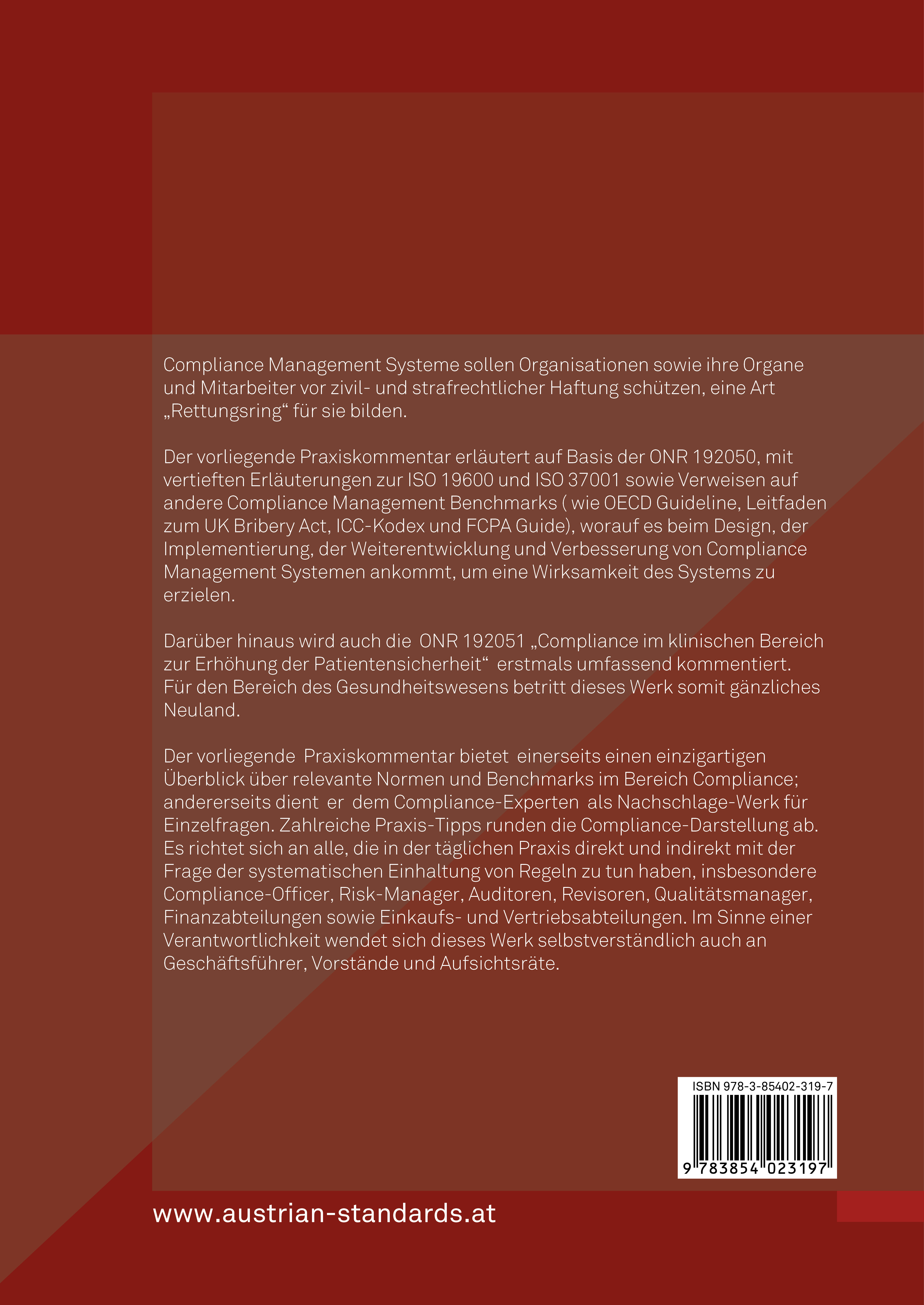 | Schlagworte | Anti Bribery • CMS • Compliance Funktion • Compliance-Kommunikation • compliance management • Compliance Management Standard • Compliance Management System • Compliance Officer (CO) • Compliance Policy • Compliancerisiko • Compliance Risikobewertung • Compliance-Training • FCPA-Guide • ICC-Kodex • IDW PS 980 • ISO 19600 • ISO 37001 • Management System • OECD-Leitfaden • ONR 192050 • ONR 192051 • Patientensicherheit • Patient Safety Officer • Qualitätssicherung • UK-BA-Leitfaden • Verhaltenskodex • Wirksamkeit von CMS |