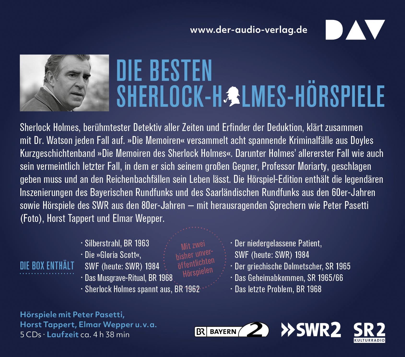Peter Pasetti, (1916–1996) wirkte in unzähligen Film- und Fernseh-Produktionen wie »Der Alte«, »Derrick« oder »Der Kommissar« mit. Der bekannte Sprecher synchronisierte u. a. Humphrey Bogart, Gary Cooper und Orson Welles. In »Die drei ???« lieh er Alfred Hitchcock seine Stimme. In der Sherlock-Holmes-Hörspielreihe des Bayerischen Rundfunks (1962-1968) sprach er in 19 Produktionen die Hauptfigur und gilt als der deutsche »Ur«-Sherlock-Holmes.