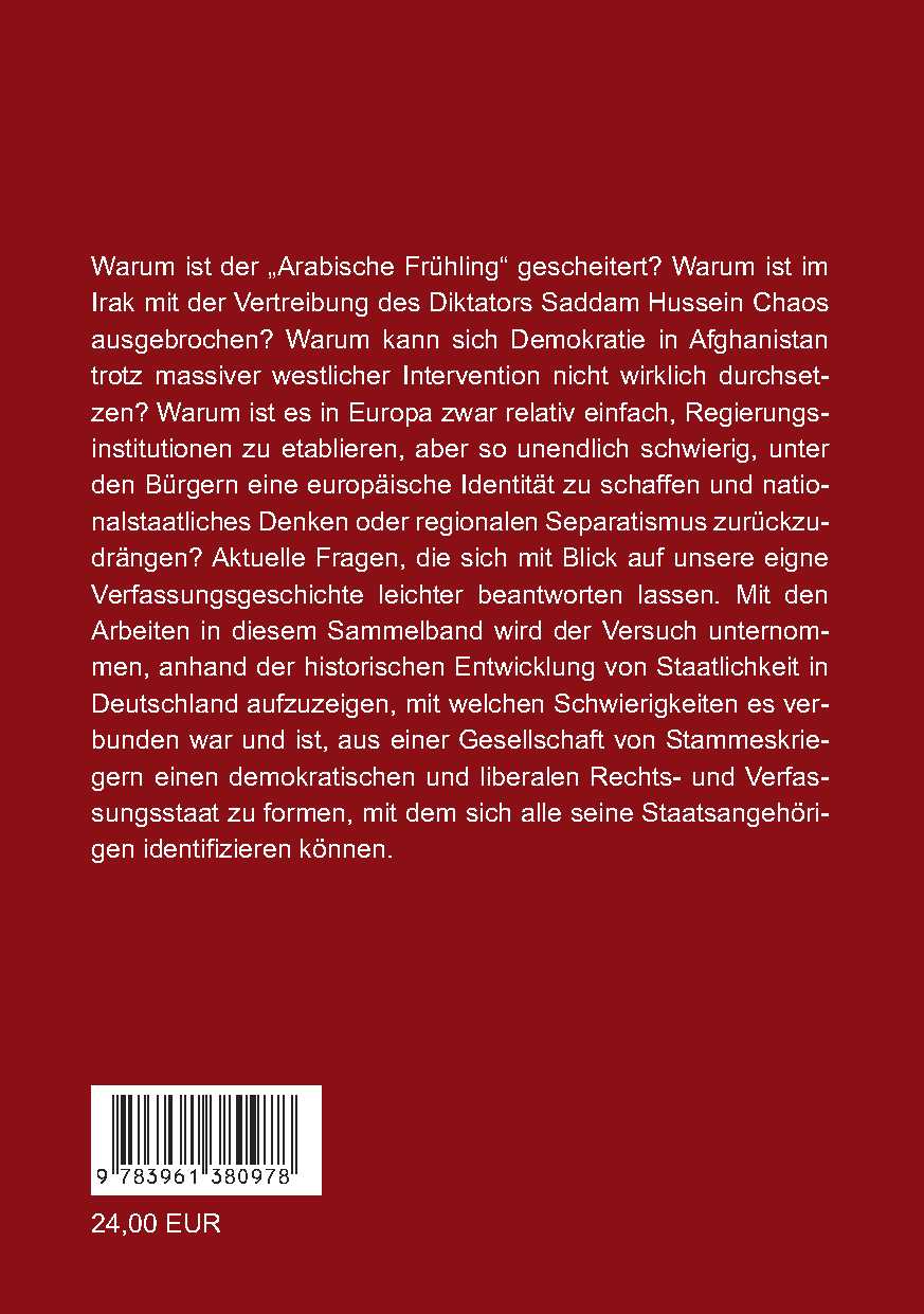 Warum ist der „Arabische Frühling“ gescheitert? Warum ist im Irak mit der Vertreibung des Diktators Saddam Hussein Chaos ausgebrochen? Warum kann sich Demokratie in Afghanistan trotz massiver westlicher Intervention nicht wirklich durchsetzen? Warum ist es in Europa zwar relativ einfach, Regierungsinstitutionen zu etablieren, aber so unendlich schwierig, unter den Bürgern eine europäische Identität zu schaffen und nationalstaatliches Denken oder regionalen Separatismus zurückzudrängen? Aktuelle Fragen, die sich mit Blick auf unsere eigne Verfassungsgeschichte leichter beantworten lassen. Mit den Arbeiten in diesem Sammelband wird der Versuch unternommen, anhand der historischen Entwicklung von Staatlichkeit in Deutschland aufzuzeigen, mit welchen Schwierigkeiten es verbunden war und ist, aus einer Gesellschaft von Stammeskriegern einen demokratischen und liberalen Rechts- und Verfassungsstaat zu formen, mit dem sich alle seine Staatsangehörigen identifizieren können.