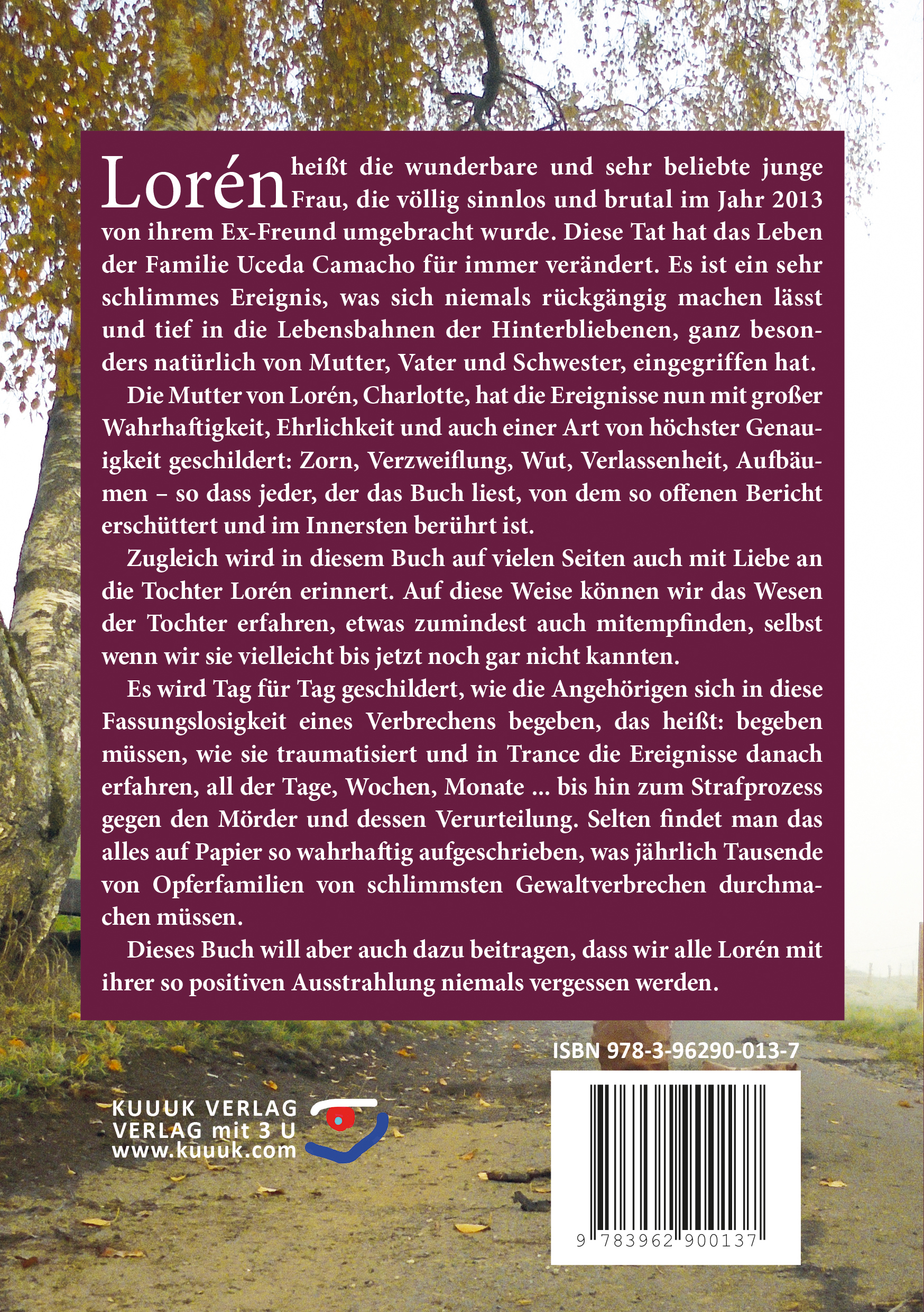 Lorén, so heißt die wunderbare und sehr beliebte junge Frau, die völlig sinnlos und brutal im Jahr 2013 von ihrem Ex-Freund umgebracht wurde. Diese Tat hat das Leben der Familie Uceda Camacho für immer verändert. Es ist ein sehr schlimmes Ereignis, was sich niemals rückgängig machen lässt und tief in die Lebensbahnen der Hinterbliebenen, ganz besonders natürlich von Mutter, Vater und Schwester, eingegriffen hat. Die Mutter von Lorén, Charlotte, hat die Ereignisse nun mit großer Wahrhaftigkeit, Ehrlichkeit und auch einer Art von höchster Genauigkeit geschildert: Zorn, Verzweiflung, Wut, Verlassenheit, Aufbäumen - so dass jeder, der das Buch liest, von dem so offenen Bericht erschüttert und im Innersten berührt ist. Zugleich wird in diesem Buch auf vielen Seiten mit Liebe an die Tochter Lorén erinnert. Auf diese Weise können wir das Wesen der Tochter erfahren, etwas zumindest auch mitempfinden, selbst wenn wir sie vielleicht bis jetzt noch gar nicht kannten. Es wird Tag für Tag geschildert, wie die Angehörigen sich in diese Fassungslosigkeit eines Verbrechens begeben, das heißt: begeben müssen, wie sie traumatisiert und in Trance die Ereignisse danach erfahren, all der Tage, Wochen, Monate ... bis hin zum Strafprozess gegen den Mörder und dessen Verurteilung. Selten findet man das alles auf Papier so wahrhaftig aufgeschrieben, was jährlich Tausende von Opferfamilien von schlimmsten Gewaltverbrechen durchmachen müssen. Dieses Buch will aber auch dazu beitragen, dass wir alle Lorén mit ihrer so positiven Ausstrahlung niemals vergessen werden. (27 Farbfotos von Lorén finden sich in dem Buch auf zusätzlichen 10 Seiten Kunstdruckpapier, alle Fotos zeigen Lorén in verschiedenen Situationen und in unterschiedlichem Alter.)