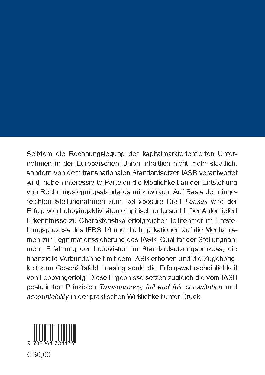 Seitdem die Rechnungslegung der kapitalmarktorientierten Unternehmen in der Europäischen Union inhaltlich nicht mehr staatlich, sondern von dem transnationalen Standardsetzer IASB verantwortet wird, haben interessierte Parteien die Möglichkeit an der Entstehung von Rechnungslegungsstandards mitzuwirken. Auf Basis der eingereichten Stellungnahmen zum ReExposure Draft Leases wird der Erfolg von Lobbyingaktivitäten empirisch untersucht. Der Autor liefert Erkenntnisse zu Charakteristika erfolgreicher Teilnehmer im Entstehungsprozess des IFRS 16 und die Implikationen auf die Mechanismen zur Legitimationssicherung des IASB. Qualität der Stellungnahmen, Erfahrung der Lobbyisten im Standardsetzungsprozess, die finanzielle Verbundenheit mit dem IASB erhöhen und die Zugehörigkeit zum Geschäftsfeld Leasing senkt die Erfolgswahrscheinlichkeit von Lobbyingerfolg. Diese Ergebnisse setzen zugleich die vom IASB postulierten Prinzipien Transparency, full and fair consultation und accountability in der praktischen Wirklichkeit unter Druck.