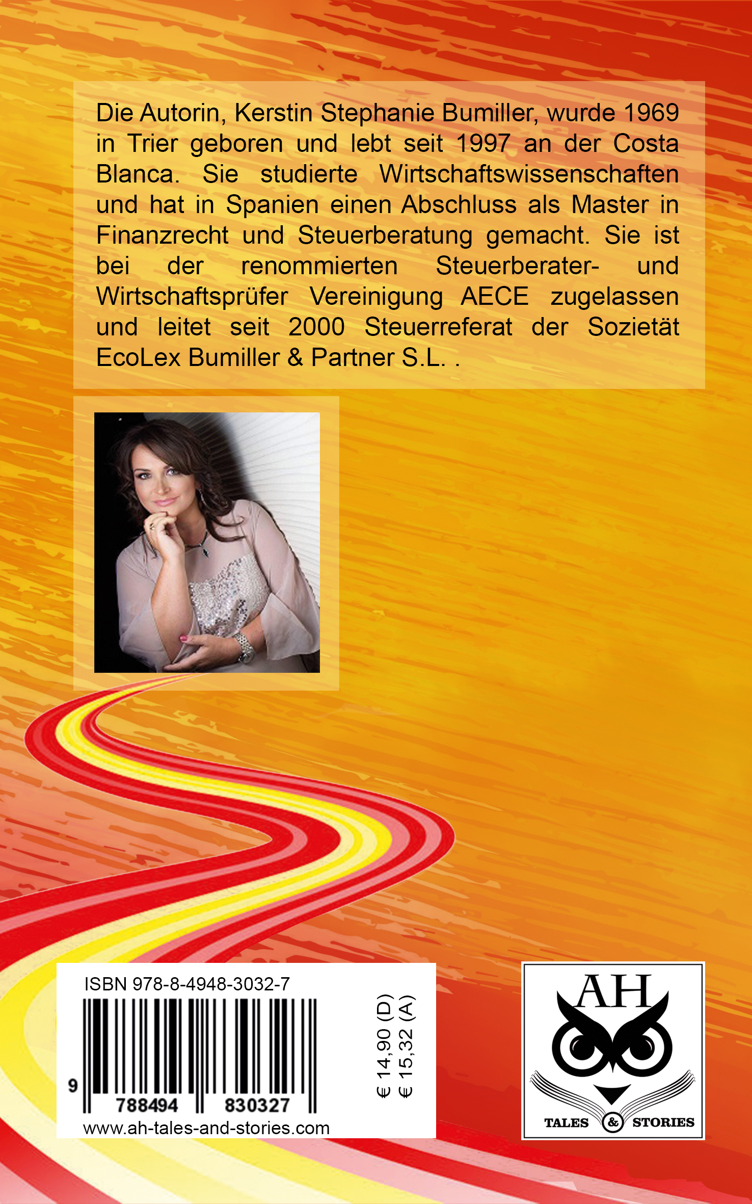 Die Autorin, Kerstin Stephanie Bumiller, wurde 1969 in Trier geboren und lebt seit 1997 an der Costa Blanca. Sie studierte Wirtschaftswissenschaften und hat in Spanien einen Abschluss als Master in Finanzrecht und Steuerberatung gemacht. Sie ist bei der renommierten Steuerberater- und Wirtschaftsprüfer-Vereinigung AECE zugelassen und leitet seit 2000 das Steuerreferat der Sozietät EcoLex Bumiller & Partner S.L.
