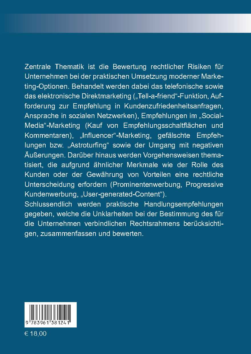 Zentrale Thematik ist die Bewertung rechtlicher Risiken für Unternehmen bei der praktischen Umsetzung moderner Marketing-Optionen. Behandelt werden dabei das telefonische sowie das elektronische Direktmarketing („Tell-a-friend“-Funktion, Aufforderung zur Empfehlung in Kundenzufriedenheitsanfragen, Ansprache in sozialen Netzwerken), Empfehlungen im „Social-Media“-Marketing (Kauf von Empfehlungsschaltflächen und Kommentaren), „Influencer“-Marketing, gefälschte Empfehlungen bzw. „Astroturfing“ sowie der Umgang mit negativen Äußerungen. Darüber hinaus werden Vorgehensweisen thematisiert, die aufgrund ähnlicher Merkmale wie der Rolle des Kunden oder der Gewährung von Vorteilen eine rechtliche Unterscheidung erfordern (Prominentenwerbung, Progressive Kundenwerbung, „User-generated-Content“).
