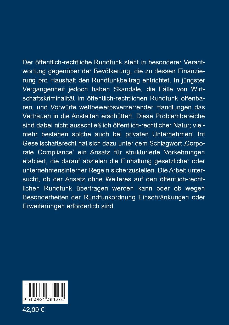 Der öffentlich-rechtliche Rundfunk steht in besonderer Verantwortung gegenüber der Bevölkerung, die zu dessen Finanzierung pro Haushalt den Rundfunkbeitrag entrichtet. In jüngster Vergangenheit jedoch haben Skandale, die Fälle von Wirtschaftskriminalität im öffentlich-rechtlichen Rundfunk offenbaren, und Vorwürfe wettbewerbsverzerrender Handlungen das Vertrauen in die Anstalten erschüttert. Diese Problembereiche sind dabei nicht ausschließlich öffentlich-rechtlicher Natur; vielmehr bestehen solche auch bei privaten Unternehmen. Im Gesellschaftsrecht hat sich dazu unter dem Schlagwort ‚Corporate Compliance‘ ein Ansatz für strukturierte Vorkehrungen etabliert, die darauf abzielen die Einhaltung gesetzlicher oder unternehmensinterner Regeln sicherzustellen. Die Arbeit untersucht, ob der Ansatz ohne Weiteres auf den öffentlich-rechtlichen Rundfunk übertragen werden kann oder ob wegen Besonderheiten der Rundfunkordnung Einschränkungen oder Erweiterungen erforderlich sind.