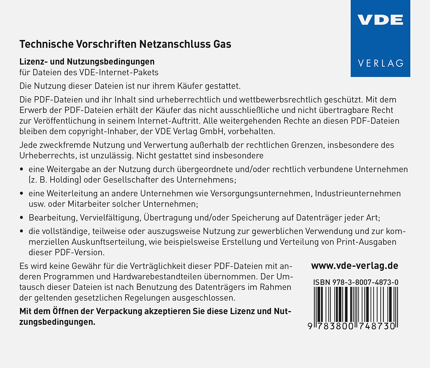 Der Erwerb dieser CD-ROM beinhaltet ein Abonnement mit Jahreslizenz. Die Mindestlaufzeit des Abonnements beträgt ein Jahr. Danach verlängert es sich automatisch um ein Jahr, wenn es nicht 3 Monate vorher schriftlich gekündigt wurde. Wird während der Laufzeit des Abonnements eine der Richtlinien/Verordnungen aktualisiert, fällt zusätzlich zur Jahreslizenzgebühr eine einmalige Aktualisierungspauschale von 42,- EUR je betroffener Richtlinie/Verordnung an.Für Bestellungen und Fragen zum Abonnement wenden Sie sich bitte an: sommer@vde-verlag.de.Betreiber von Gasversorgungsnetzen müssen nach