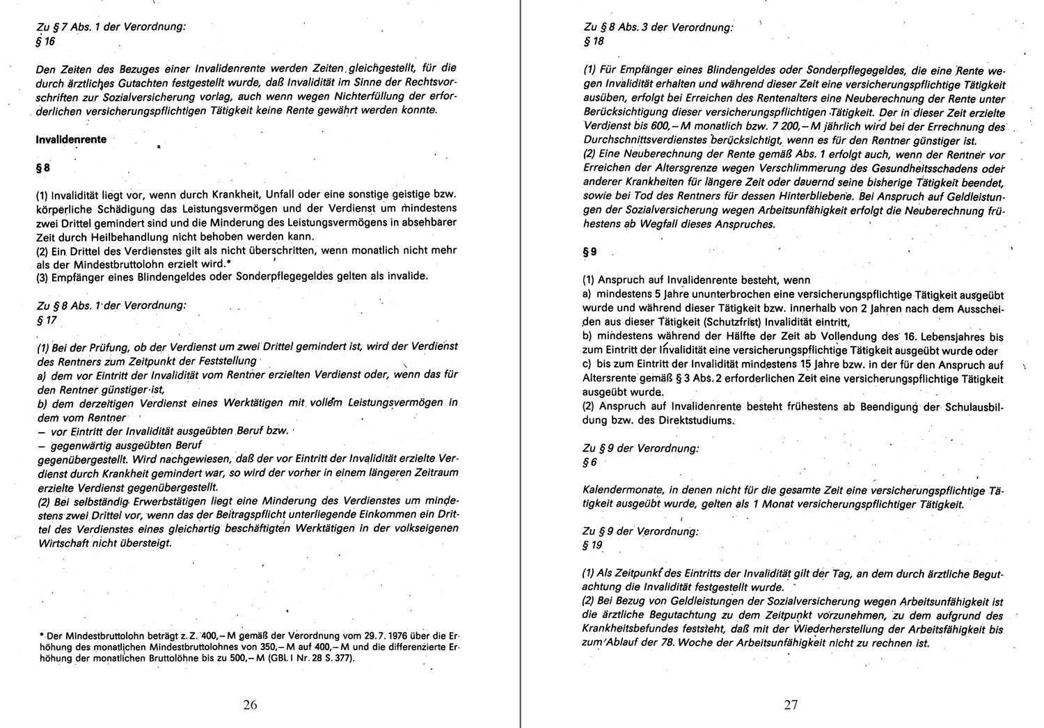 Taschenbuch, Reprint, 132 Seiten, Rentenversorgung der Arbeiter und Angestellten - Bergmannsrente - Unterhaltsrente - FZR-Verordnung, Rente für Frauen ab 60, Rente für Männer ab 65. Mit einer Liste der Preise in der DDR bis 1989INHALTGewährung und Berechnung von Renten der Sozialpflichtversicherung 1. Rentenverordnung 1979 1. Verordnung über die Gewährung und Berechnung von Renten der Sozialpflichtversicherung vom 23. November 1979 (GBl. I Nr. 43 S. 401)2. Rentenverordnung 1984 2. Verordnung über die Gewährung und Berechnung von Renten der Sozialpflichtversicherung vom 26. Juli 1984 (GBl. I Nr. 23 S. 281)Gewährung und Berechnung von Zusatzrenten aus der freiwilligen Zusatzrentenversicherung der Sozialversicherung FZR-Verordnung 1977 Verordnung über die freiwillige Zusatzrentenversicherung der Sozialversicherung vom 17. November 1977 (GBl. I Nr. 35 S. 395)