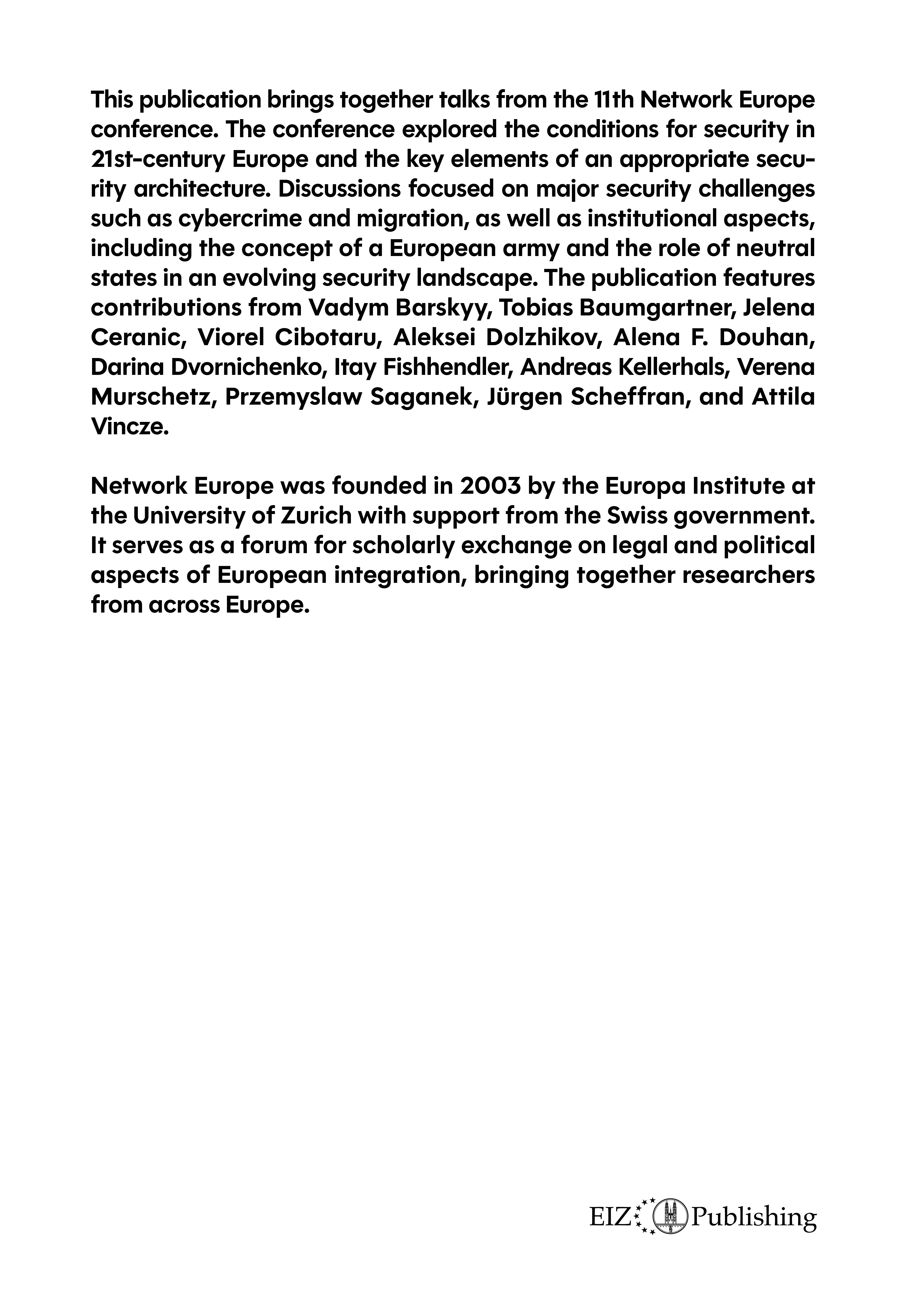 This publication explores the conditions for security in 21st-century Europe and the key elements of an appropriate security architecture and focuses on major security challenges such as cybercrime and migration, as well as the concept of a European army and the role of neutral states in an evolving security landscape.