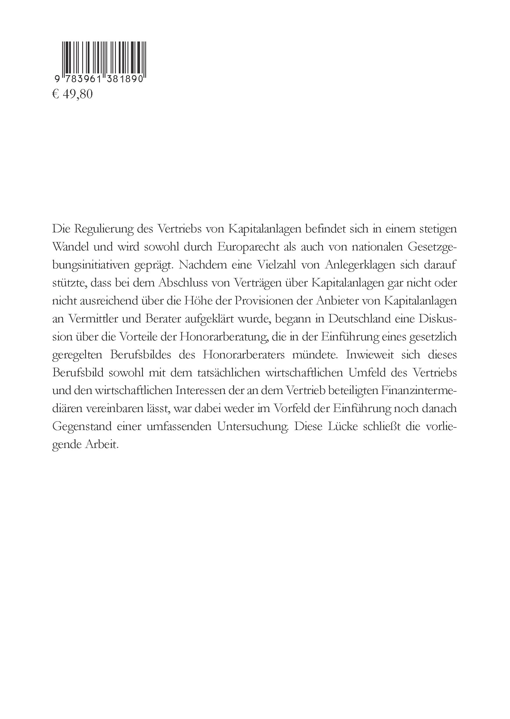Die Regulierung des Vertriebs von Kapitalanlagen befindet sich in einem stetigen Wandel und wird sowohl durch Europarecht als auch von nationalen Gesetzgebungsinitiativen geprägt. Nachdem eine Vielzahl von Anlegerklagen sich darauf stützte, dass bei dem Abschluss von Verträgen über Kapitalanlagen gar nicht oder nicht ausreichend über die Höhe der Provisionen der Anbieter von Kapitalanlagen an Vermittler und Berater aufgeklärt wurde, begann in Deutschland eine Diskussion über die Vorteile der Honorarberatung, die in der Einführung eines gesetzlich geregelten Berufsbildes des Honorarberaters mündete. Inwieweit sich dieses Berufsbild sowohl mit dem tatsächlichen wirtschaftlichen Umfeld des Vertriebs und den wirtschaftlichen Interessen der an dem Vertrieb beteiligten Finanzintermediären vereinbaren lässt, war dabei weder im Vorfeld der Einführung noch danach Gegenstand einer umfassenden Untersuchung. Diese Lücke schließt die vorliegende Arbeit.