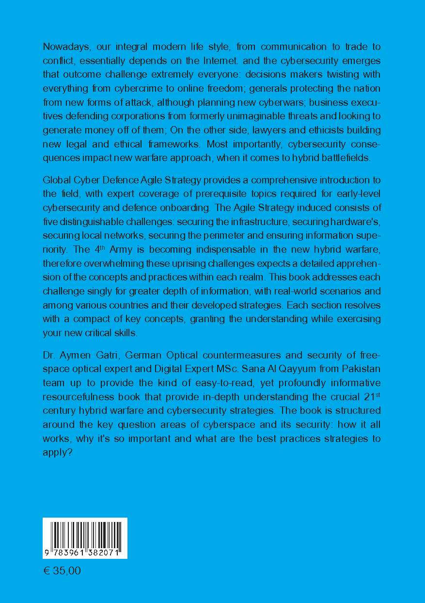 Dr. Aymen Gatri, German Optical countermeasures and security of free-space optical expert and Digital Expert MSc. Sana Al Qayyum from Pakistan team up to provide the kind of easy-to-read, yet profoundly informative resourcefulness book that provide in-depth understanding the crucial 21st century hybrid warfare and cybersecurity strategies. The book is structured around the key question areas of cyberspace and its security: how it all works, why it's so important and what are the best practices strategies to apply?