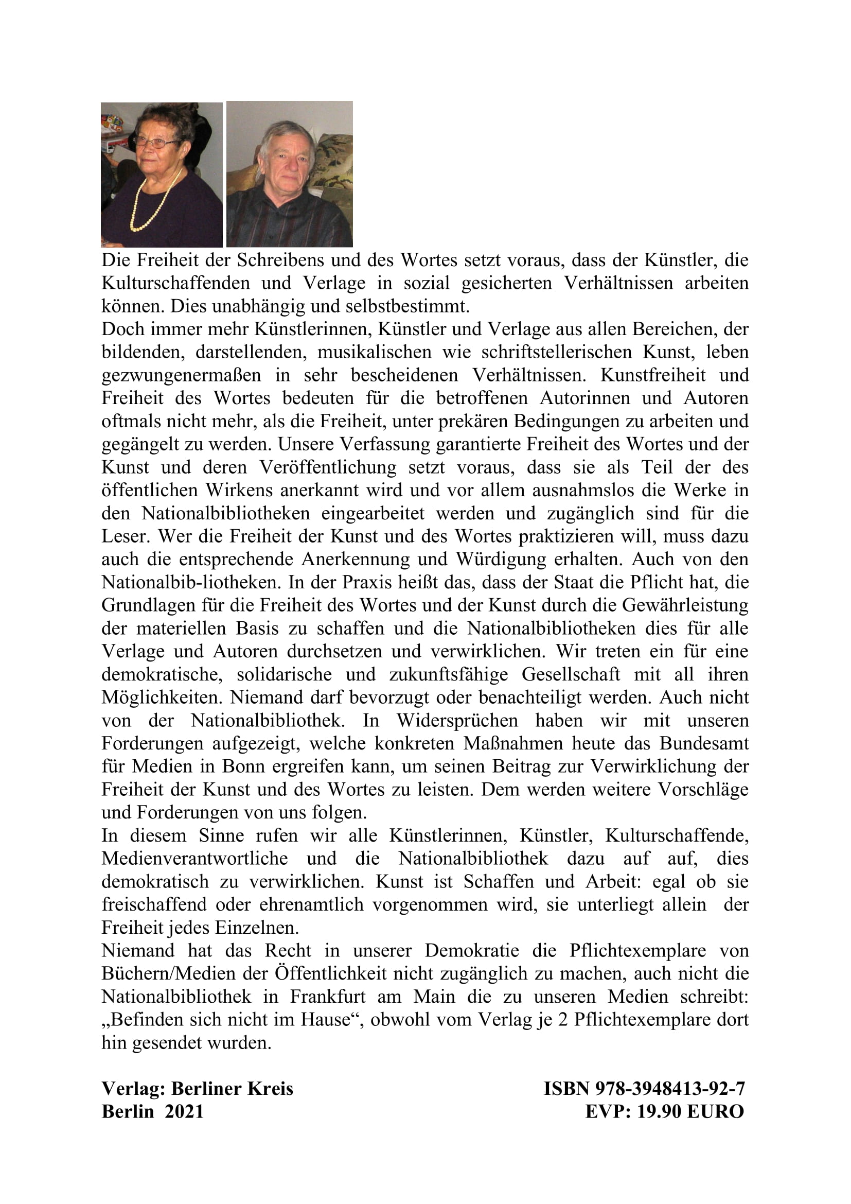 Doch immer mehr Künstlerinnen, Künstler und Verlage aus allen Bereichen, der bildenden, darstellenden, musikalischen wie schriftstellerischen Kunst, leben gezwungenermaßen in sehr bescheidenen Verhältnissen. Kunstfreiheit und Freiheit des Wortes bedeuten für die betroffenen Autorinnen und Autoren oftmals nicht mehr, als die Freiheit, unter prekären Bedingungen zu arbeiten und gegängelt zu werden. Unsere Verfassung garantierte Freiheit des Wortes und der Kunst und deren Veröffentlichung setzt voraus, dass sie als Teil der des öffentlichen Wirkens anerkannt wird und vor allem ausnahmslos die Werke in den Nationalbibliotheken eingearbeitet werden und zugänglich sind für die Leser. Wer die Freiheit der Kunst und des Wortes praktizieren will, muss dazu auch die entsprechende Anerkennung und Würdigung erhalten. Auch von den Nationalbibliotheken. In der Praxis heißt das, dass der Staat die Pflicht hat, die Grundlagen für die Freiheit des Wortes und der Kunst durch die Gewährleistung der materiellen Basis zu schaffen und die Nationalbibliotheken dies für alle Verlage und Autoren durchsetzen und verwirklichen. Wir treten ein für eine demokratische, solidarische und zukunftsfähige Gesellschaft mit all ihren Möglichkeiten. Niemand darf bevorzugt oder benachteiligt werden. Auch nicht von der Nationalbibliothek. In Widersprüchen haben wir mit unseren Forderungen aufgezeigt, welche konkreten Maßnahmen heute das Bundesamt für Medien in Bonn ergreifen kann, um seinen Beitrag zur Verwirklichung der Freiheit der Kunst und des Wortes zu leisten. Dem werden weitere Vorschläge und Forderungen von uns folgen.