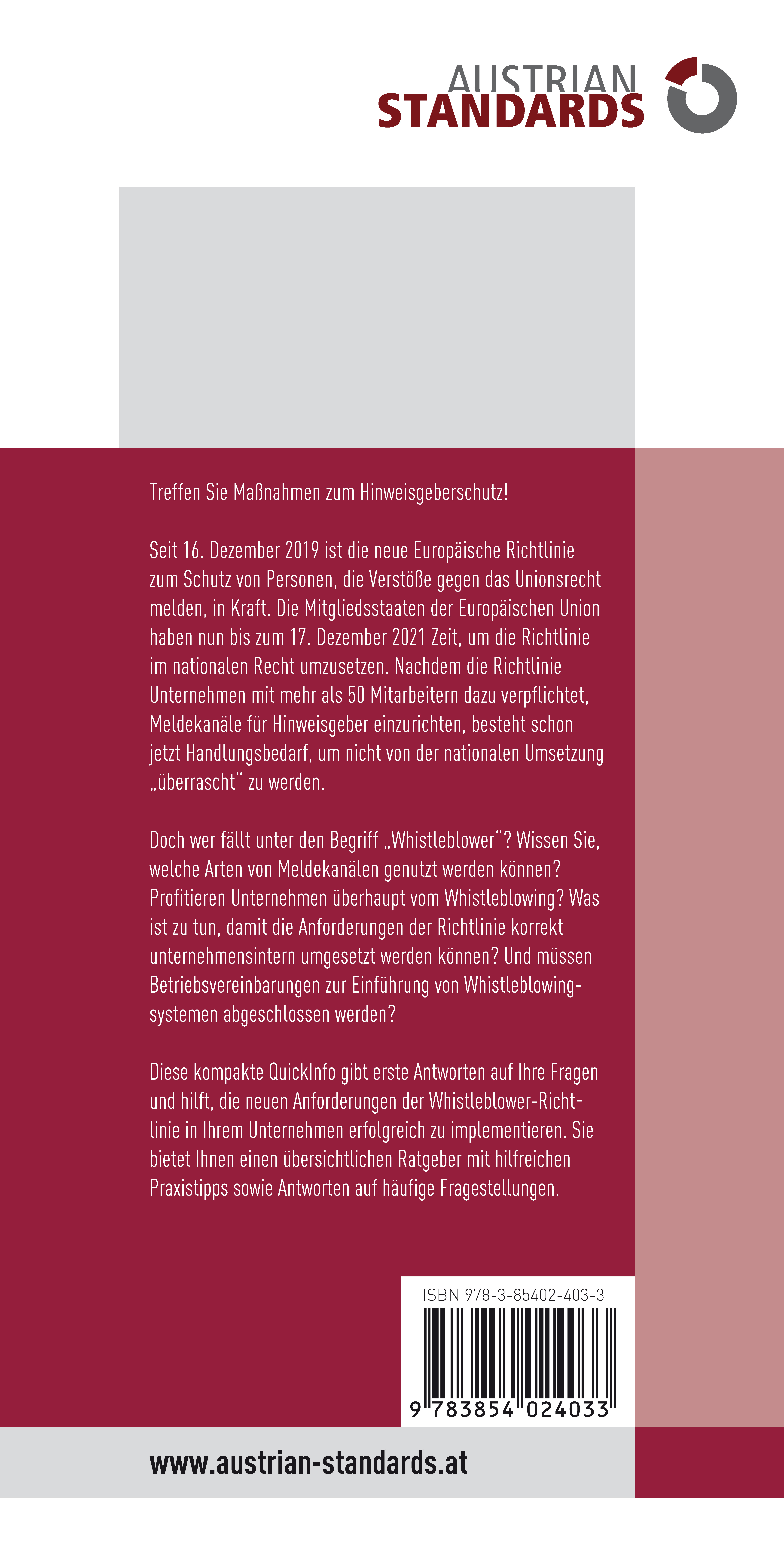 Diese kompakte QuickInfo gibt erste Antworten auf Ihre Fragen und hilft, die neuen Anforderungen der Whistleblower-Richtlinie in Ihrem Unternehmen erfolgreich zu implementieren. Sie bietet Ihnen einen übersichtlichen Ratgeber mit hilfreichen Praxistipps sowie Antworten auf häufige Fragestellungen.
