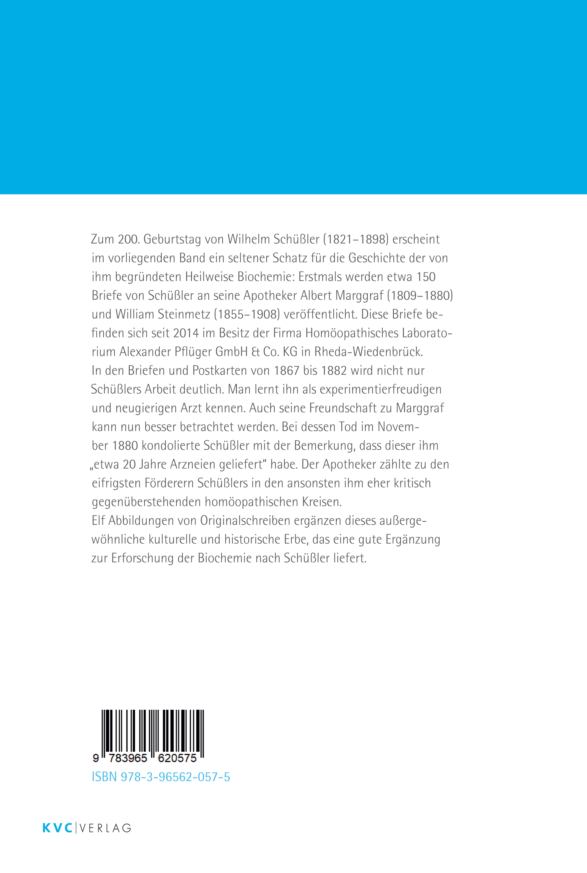 Zum 200. Geburtstag von Wilhelm Schüßler (1821–1898) erscheint im vorliegenden Band ein seltener Schatz für die Geschichte der von ihm begründeten Heilweise Biochemie: Erstmals werden etwa 150 Briefe von Schüßler an seine Apotheker Albert Marggraf (1809–1880) und William Steinmetz (1855–1908) veröffentlicht. Diese Briefe befinden sich seit 2014 im Besitz der Firma Homöopathisches Laboratorium Alexander Pflüger GmbH & Co. KG in Rheda-Wiedenbrück.