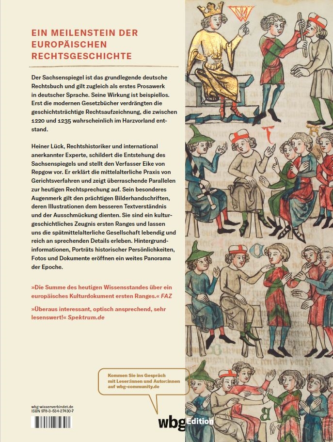 »Eine exzellente kommentierte, vollständige, illustrierte Ausgabe mit den Ergebnissen aktueller Forschung zu diesem grundlegenden Werk des Rechts.« Sedina-Archiv »Erstrangig: Heiner Lück macht eingängig und ganz ohne Fachjargon mit dem "Sachsenspiegel" bekannt. « FAZ »Was Heiner Lück hier vorlegt, sollte man keineswegs als Coffeetable-Book abtun, weil es eingängig geschrieben und ausgezeichnet illustriert ist. In Wirklichkeit ist es eine Summe des heutigen Wissensstandes über ein europäisches Kulturdokument ersten Ranges.« FAZ »Lück hat mit seinem überaus interessanten und optisch ansprechenden Bildband ein sehr lesenswertes Buch geschaffen, das den heutigen Wissenstand zu einem bedeutenden Werk europäischer Rechtsgeschichte umfassend darlegt.« spektrum.de »Eine Abentuerreise zu einem Leuchtturm deutscher Kulturgeschichte« Bocholter Borkener Volksblatt »...ist es eine Summe des heutigen Wissenstandes über ein europäisches Kulturdokument ersten Ranges.« (Fachbuchjournal) »Dieses großformatige Buch ist nichts weniger als eine Großtat!« (Fachbuchjournal) »Themen-Specials, Porträts historischer Persönlichkeiten, Fotos und Dokumente eröffnen ein weites Panorama der Epoche.« Buch-Magazin