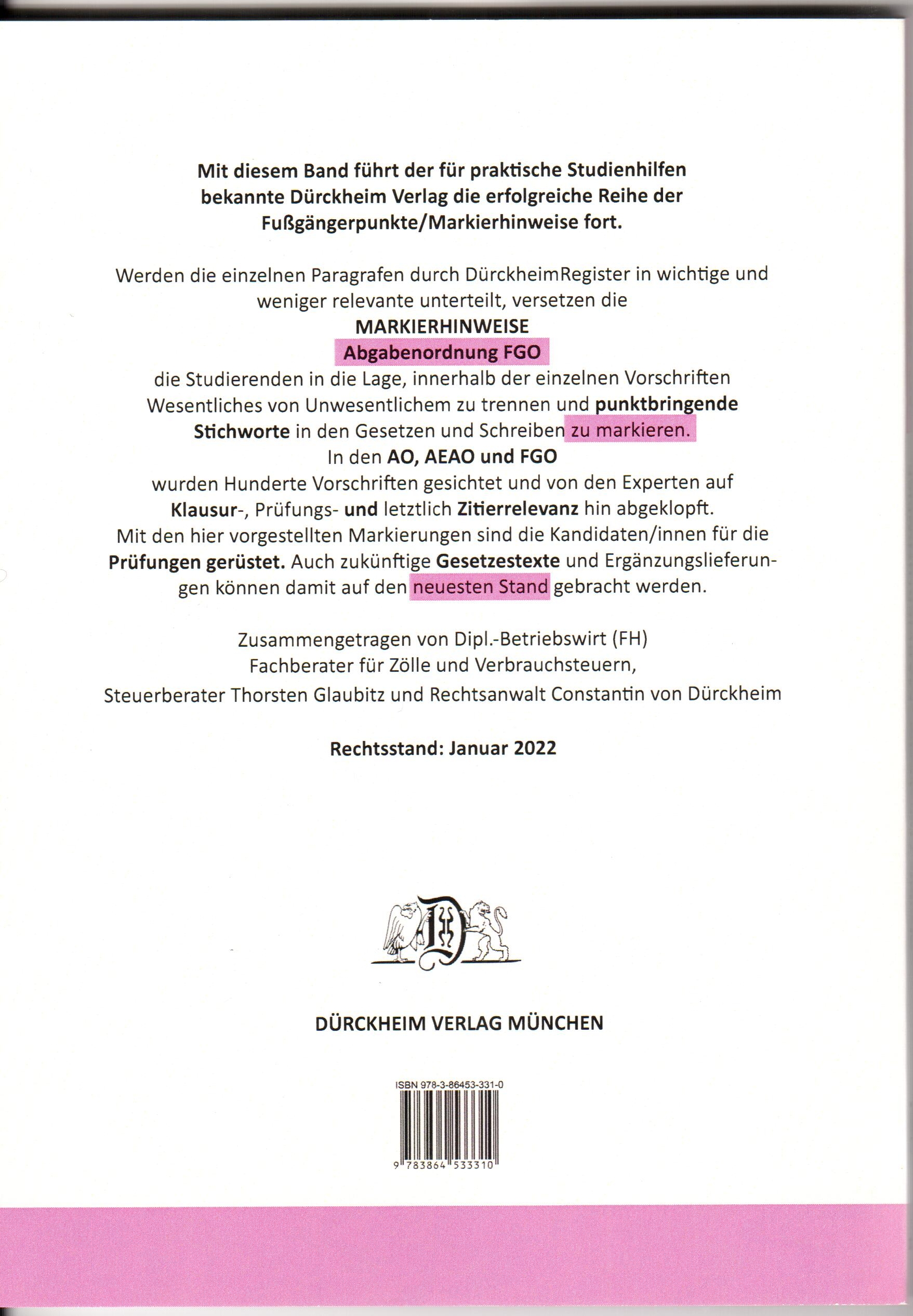 Mit diesem Band führt der für praktische Studienhilfen bekannte Dürckheim Verlag die erfolgreiche Reihe der Fußgängerpunkte/Markierhinweise fort. Werden die einzelnen Paragrafen durch DürckheimRegister® in wichtige und weniger relevante unterteilt, versetzen die MARKIERHINWEISE Abgabenordnung und Finanzgerichtsordnung die Studierenden in die Lage, innerhalb der einzelnen Vorschriften Wesentliches von Unwesentlichem zu trennen und punktbringende Stichworte in den Gesetzen und Schreiben zu markieren. Hunderte von Vorschriften wurden gesichtet und von den Experten auf Klausur-, Prüfungs- und letztlich Zitierrelevanz hin abgeklopft. Mit den hier vorgestellten Markierungen sind die Kandidaten/innen für die Prüfungen gerüstet und können zukünftige Gesetzestexte und Ergänzungslieferungen auf den neuesten Stand gebracht werden.