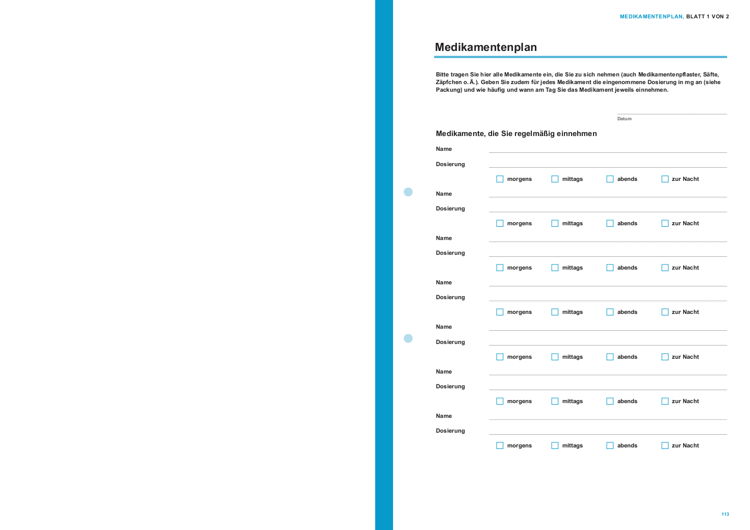 - Zum Heraustrennen und Herunterladen: Vordrucke und Formulare zur Notfall-Vorsorge von Medikamentenplan über Patientenverfügung bis zur Schweigepflichtentbindung