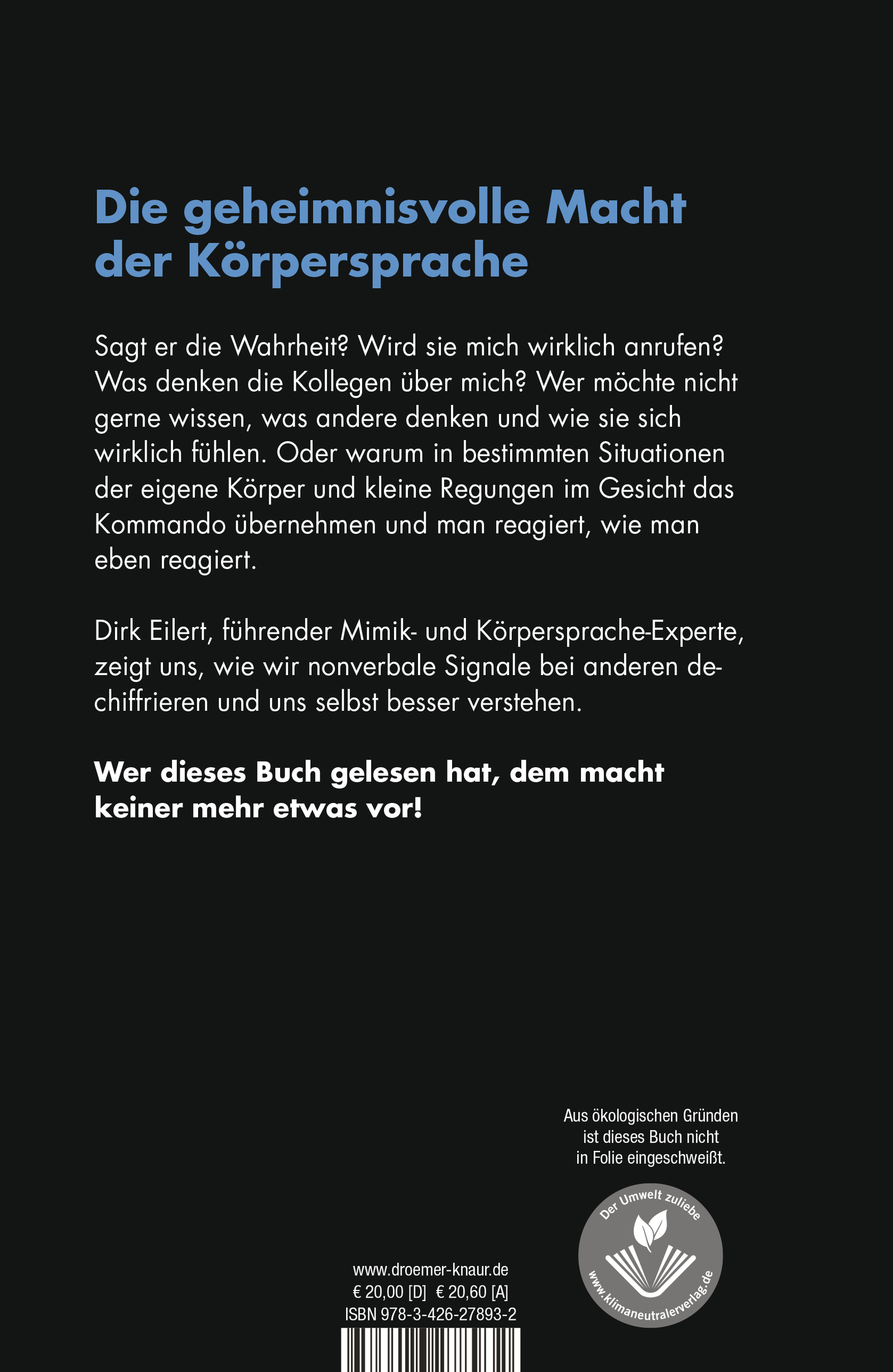 Dirk W. Eilert, Top-Experte und Leiter der Eilert-Akademie, führt in seinem Buch durch alle relevanten Körpersprache-Themen und erzählt anschaulich seine kniffligsten, ungewöhnlichsten und berühmtesten Analyse-Fälle: Als Experte für die Presse, Gutachter für Banken, Berater und Coach für u.a. Polizei und Justiz, nicht zuletzt als Sparringspartner von Sebastian Fitzek bei seinem Thriller "Mimik" - über den alles entscheidenden Augenblick ...