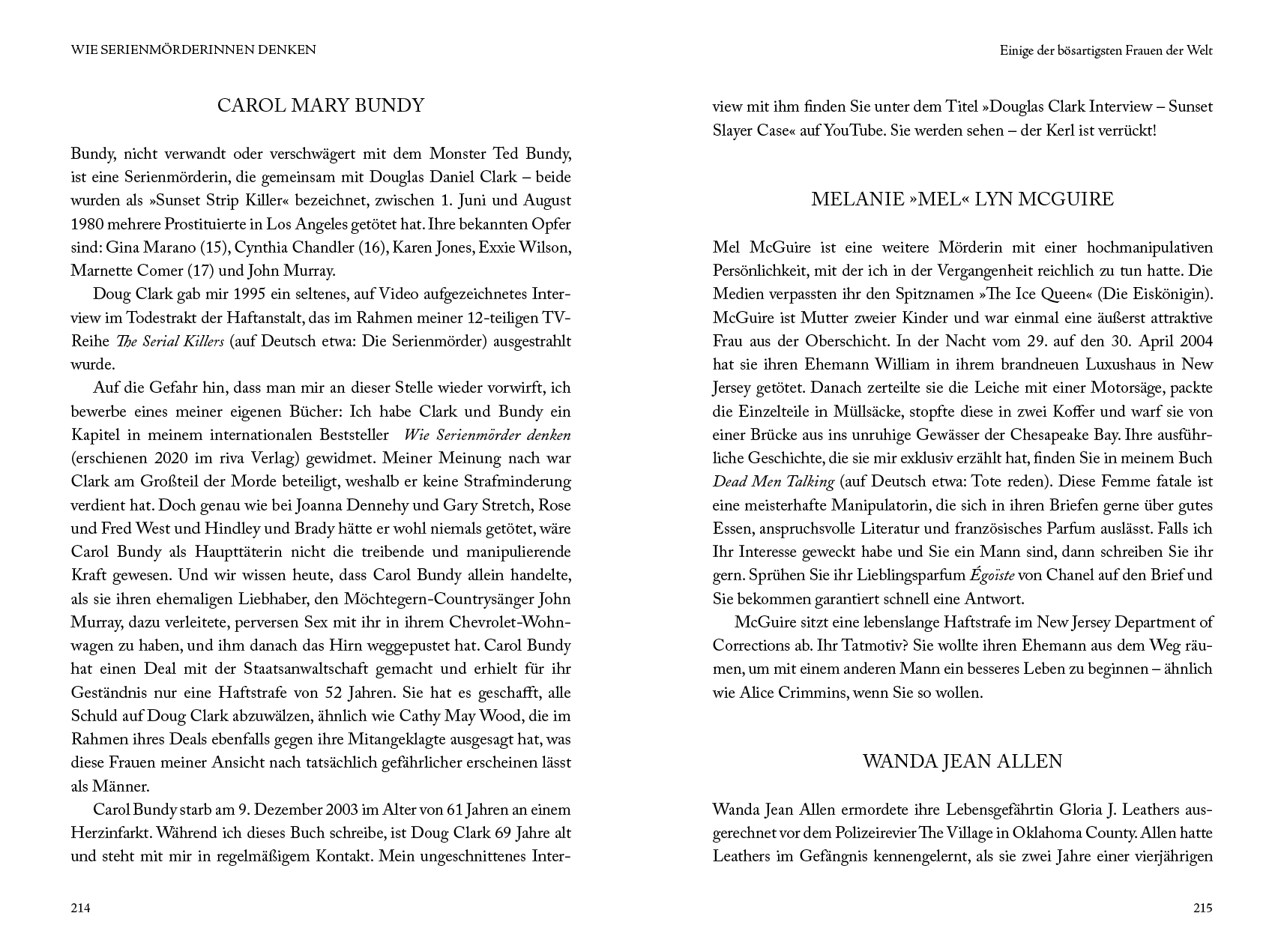 [...] True-Crime-Fans erfahren hier einiges über die weibliche Gier nach Blut. Penthouse, 02/03-2023 True Crime-Fans aufgepasst: Dieses Buch darf in euren Regalen auf keinen Fall fehlen! Schonungslos und mit dem richtigen Maß an juristischem Hintergrundwissen durchleuchtet der weltweit angesehene britische Kriminologe Christopher Berry-Dee die Abgründe der weiblichen Psyche. recensio-online, 08.03.2023