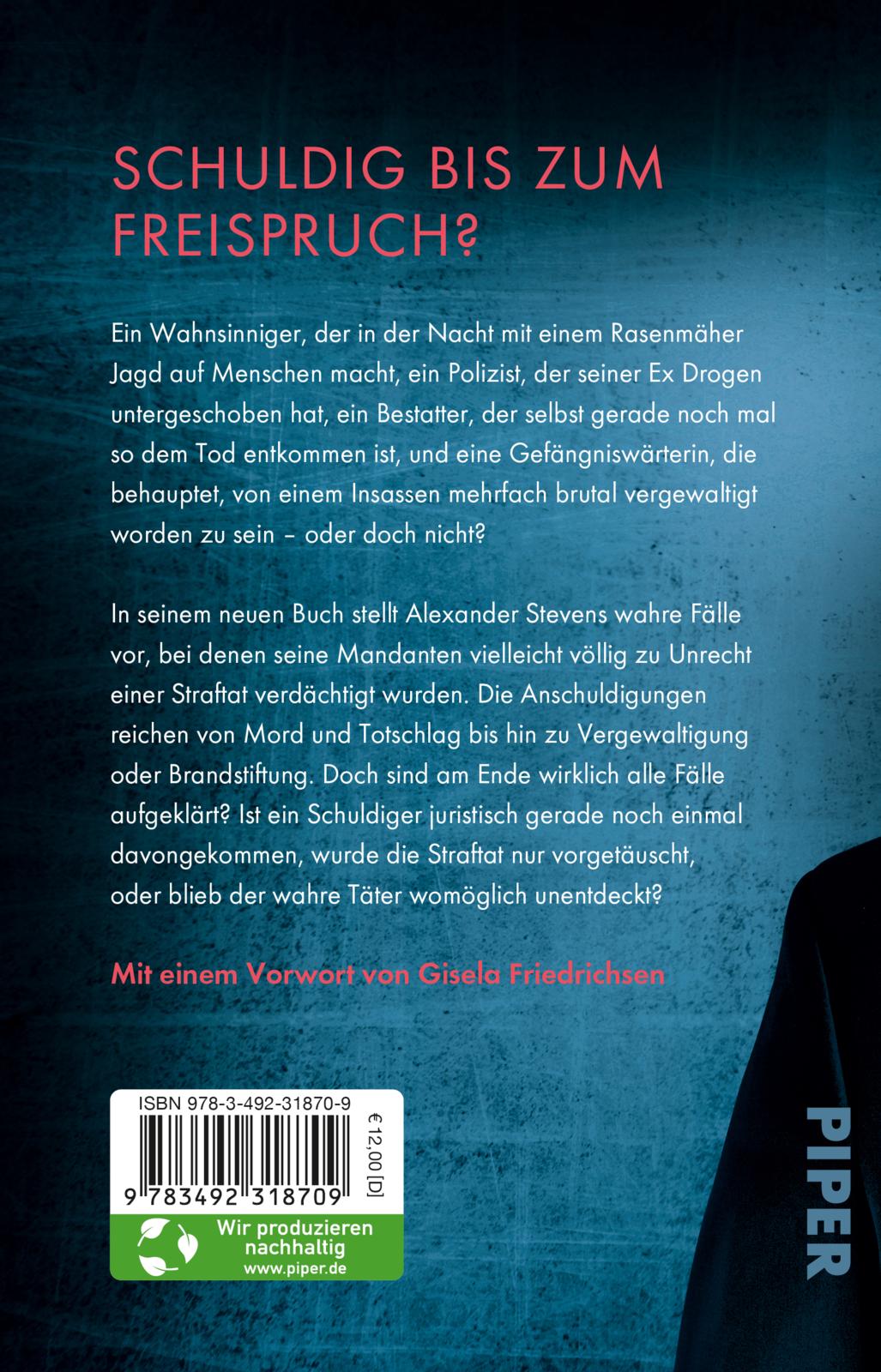 Ein Arzt mit Geldproblemen, dessen vermögende Mutter plötzlich verstirbt, und eine Gefängnispsychologin, die behauptet, von einem Insassen erpresst zu werden ... In seinem neuen Buch stellt Alexander Stevens wahre Fälle vor, bei denen seine Mandant:innen behaupten, zu Unrecht verdächtigt worden zu sein. Die Anschuldigungen reichen von Körperverletzung, Brandstiftung und Diebstahl bis hin zu mutmaßlichen Sexual- und Tötungsdelikten. Doch werden wirklich in allen Fällen die Richtigen verdächtigt oder bleibt der wahre Täter womöglich unentdeckt?