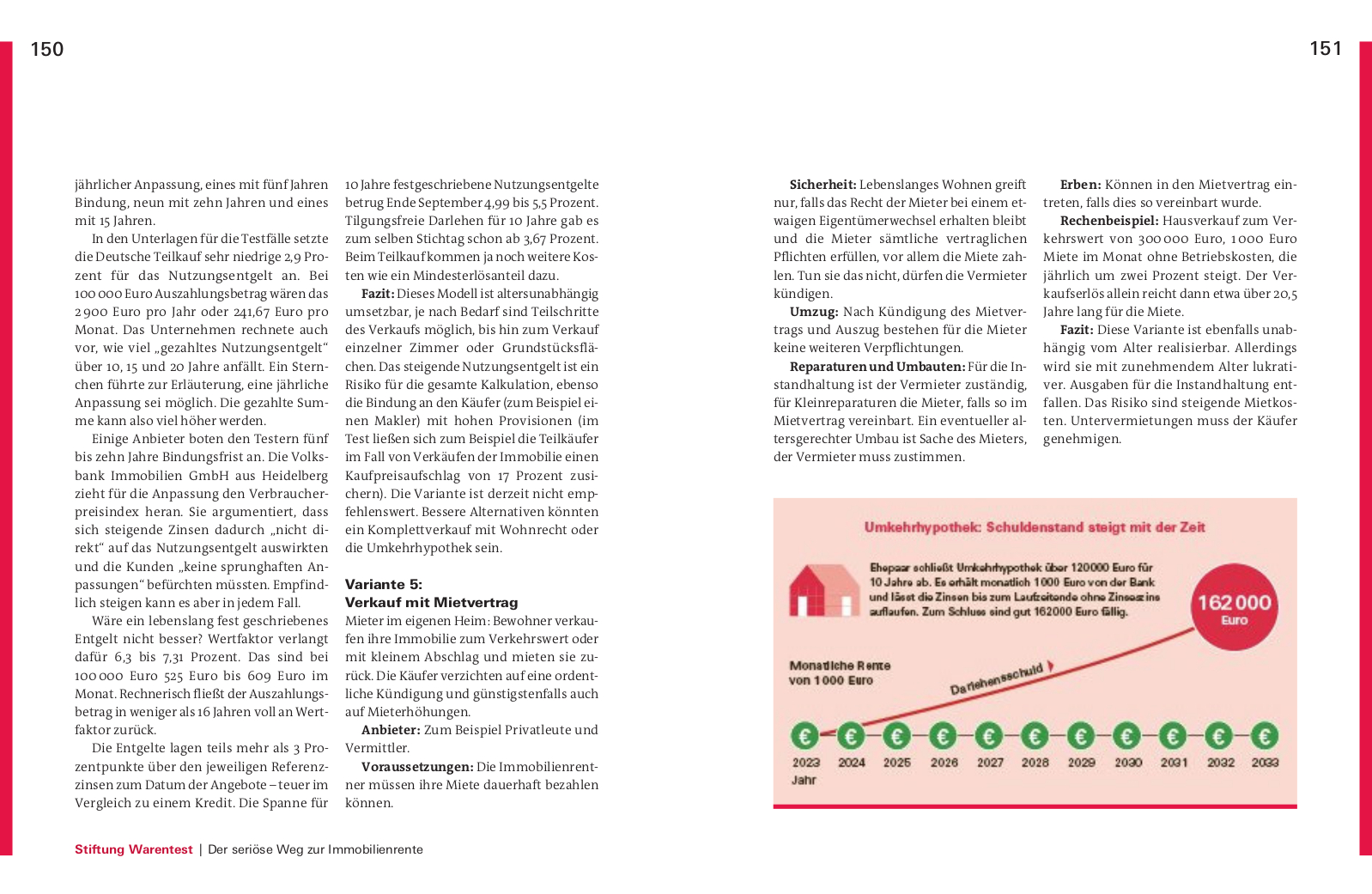 Die Rentenexpertinnen und -experten der Stiftung Warentest liefern mit Beispielrechnung und nützlichen Checklisten verständliches Wissen, um Ihren neuen Lebensabschnitt zu gliedern. Es gibt vier Wege zur Aufstockung Ihres Ruhegeldes. Der erste Weg ist es, sich einen Überblick über die eigenen Finanzen zu verschaffen. Erst mit dem Aufspüren von Vermögenswerten lässt sich sinnvoll eine Zusatzrente planen. Der zweite Weg sind Kapitalanlagen, deren Zinsen, Dividenden oder Gewinne über eine Sofortrente oder einen Auszahlplan ausgeschüttet werden können. Auch Immobilien lassen sich in eine Rente umwandeln, genauso wie Sachwerte durch Verleih oder Vermietung.