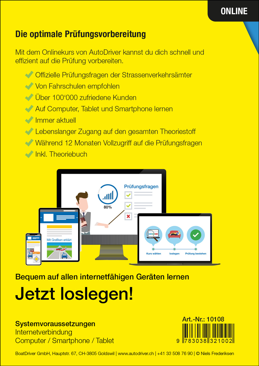 | Schlagworte | App • Autoprüfung • E-Learning • Kat. B • Lizenzkarte • Onlinekurs • Prüfungsfragen • Theoriebuch • Theoriefragen • Theorieprüfung |