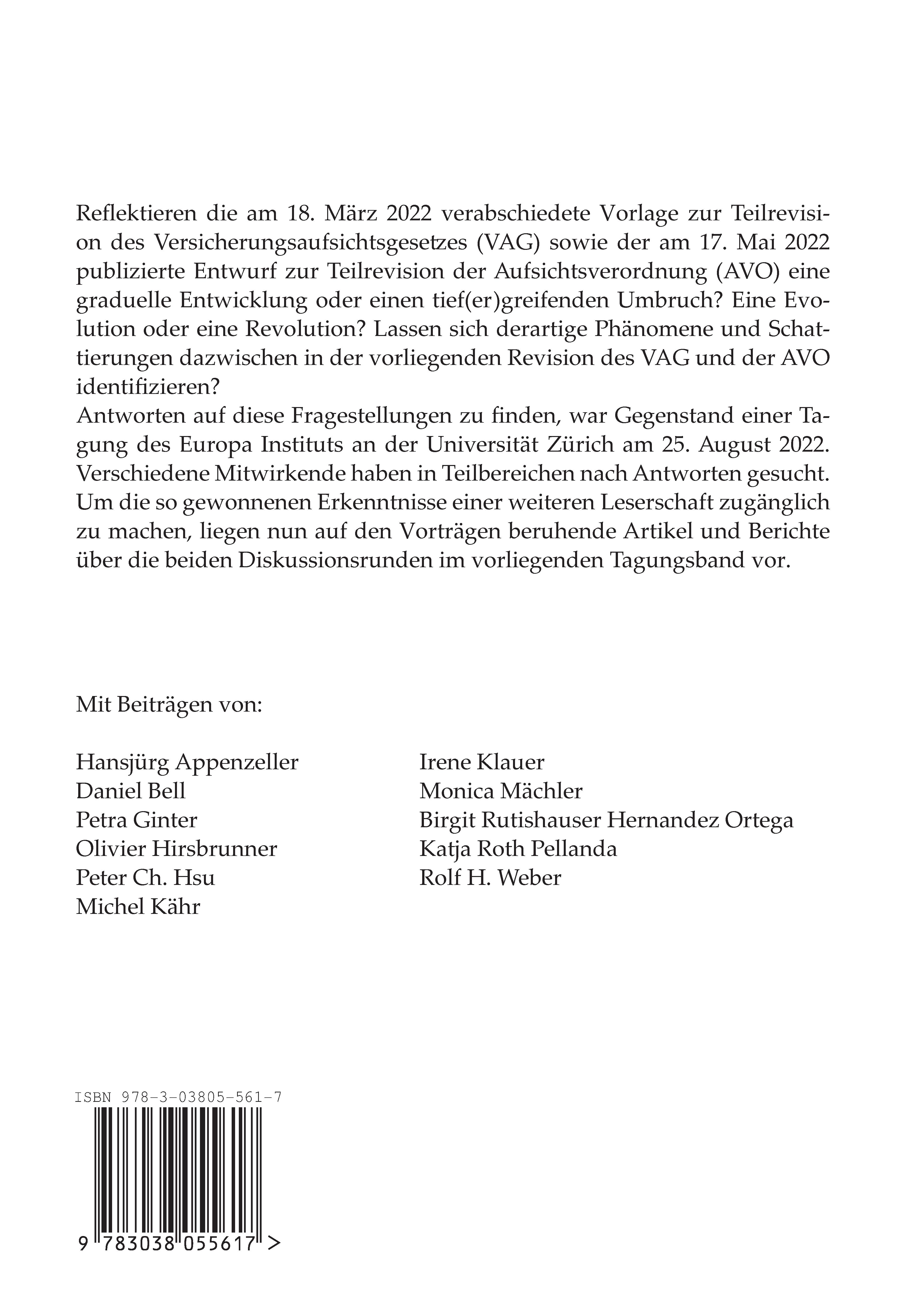 Reflektieren die am 18. März 2022 verabschiedete Vorlage zur Teilrevision des Versicherungsaufsichtsgesetzes (VAG) sowie der am 17. Mai 2022 publizierte Entwurf zur Teilrevision der Aufsichtsverordnung (AVO) eine graduelle Entwicklung oder einen tief(er)greifenden Umbruch? Eine Evolution oder eine Revolution? Lassen sich derartige Phänomene und Schattierungen dazwischen in der vorliegenden Revision des VAG und der AVO identifizieren?Antworten auf diese Fragestellungen zu finden, war Gegenstand einer Tagung des Europa Instituts an der Universität Zürich am 25. August 2022. Verschiedene Mitwirkende haben in Teilbereichen nach Antworten gesucht. Um die so gewonnenen Erkenntnisse einer weiteren Leserschaft zugänglich zu machen, liegen nun auf den Vorträgen beruhende Artikel und Berichte über die beiden Diskussionsrunden im vorliegenden Tagungsband vor.