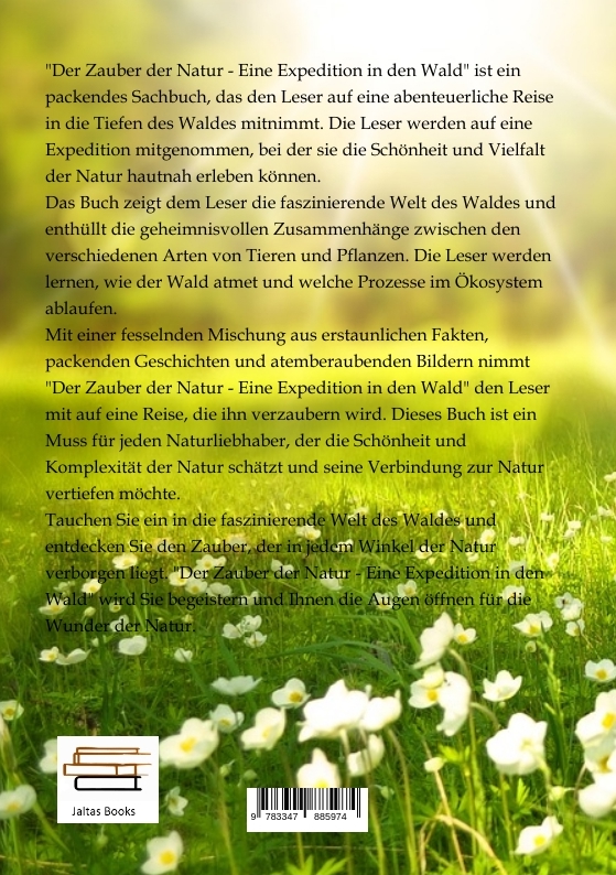 "Der Zauber der Natur - Eine Expedition in den Wald" ist ein packendes Sachbuch, das den Leser auf eine abenteuerliche Reise in die Tiefen des Waldes mitnimmt. Die Leser werden auf eine Expedition mitgenommen, bei der sie die Schönheit und Vielfalt der Natur hautnah erleben können. Das Buch zeigt dem Leser die faszinierende Welt des Waldes und enthüllt die geheimnisvollen Zusammenhänge zwischen den verschiedenen Arten von Tieren und Pflanzen. Die Leser werden lernen, wie der Wald atmet und welche Prozesse im Ökosystem ablaufen.Mit einer fesselnden Mischung aus erstaunlichen Fakten, packenden Geschichten und atemberaubenden Bildern nimmt "Der Zauber der Natur - Eine Expedition in den Wald" den Leser mit auf eine Reise, die ihn verzaubern wird. Dieses Buch ist ein Muss für jeden Naturliebhaber, der die Schönheit und Komplexität der Natur schätzt und seine Verbindung zur Natur vertiefen möchte.Tauchen Sie ein in die faszinierende Welt des Waldes und entdecken Sie den Zauber, der in jedem Winkel der Natur verborgen liegt. "Der Zauber der Natur - Eine Expedition in den Wald" wird Sie begeistern und Ihnen die Augen öffnen für die Wunder der Natur.