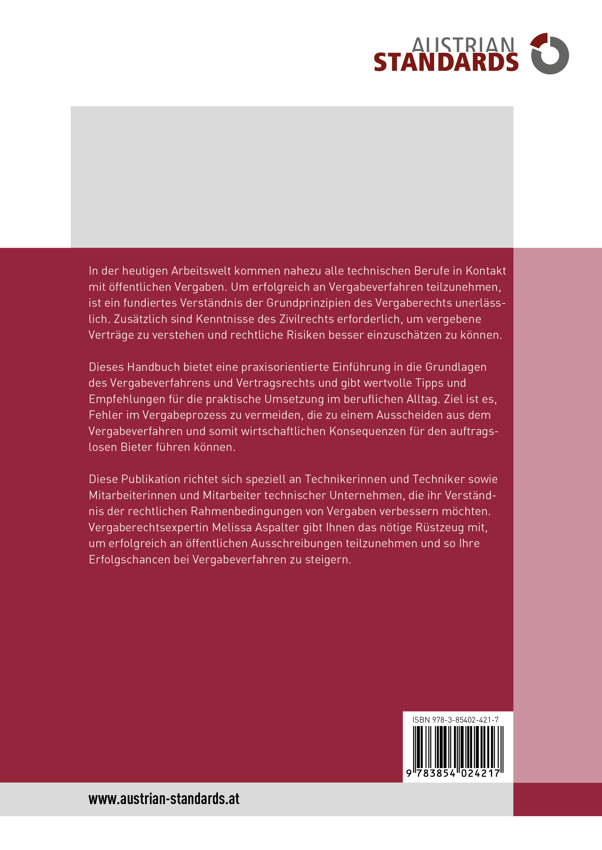 Diese Publikation richtet sich speziell an Technikerinnen und Techniker sowie Mitarbeiterinnen und Mitarbeiter technischer Unternehmen, die ihr Verständnis der rechtlichen Rahmenbedingungen von Vergaben verbessern möchten. Vergaberechtsexpertin Melissa Aspalter gibt Ihnen das nötige Rüstzeug mit, um erfolgreich an öffentlichen Ausschreibungen teilzunehmen und so Ihre Erfolgschancen bei Vergabeverfahren zu steigern.
