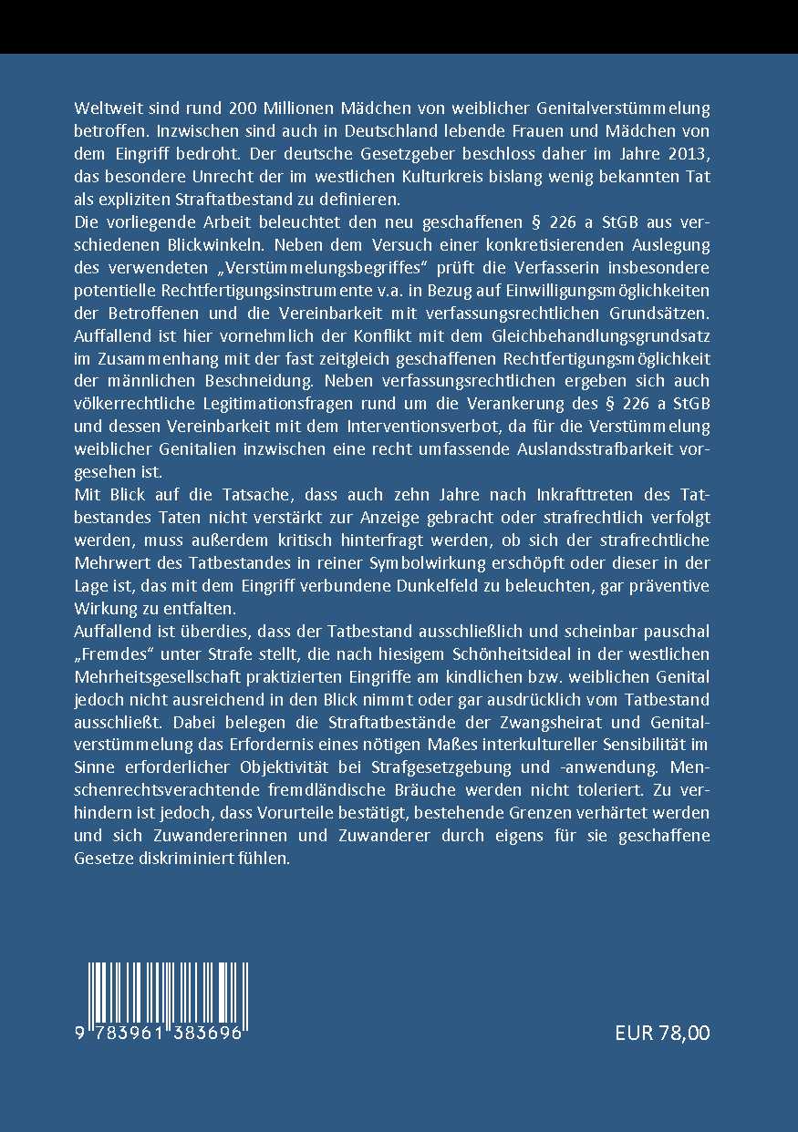 Die vorliegende Arbeit beleuchtet den neu geschaffenen § 226 a StGB aus verschiedenen Blickwinkeln. Neben dem Versuch einer konkretisierenden Auslegung des verwendeten „Verstümmelungsbegriffes“ prüft die Verfasserin insbesondere potentielle Rechtfertigungsinstrumente v.a. in Bezug auf Einwilligungsmöglichkeiten der Betroffenen und die Vereinbarkeit mit verfassungsrechtlichen Grundsätzen. Auffallend ist hier vornehmlich der Konflikt mit dem Gleichbehandlungsgrundsatz im Zusammenhang mit der fast zeitgleich geschaffenen Rechtfertigungsmöglichkeit der männlichen Beschneidung. Neben verfassungsrechtlichen ergeben sich auch völkerrechtliche Legitimationsfragen rund um die Verankerung des § 226 a StGB und dessen Vereinbarkeit mit dem Interventionsverbot, da für die Verstümmelung weiblicher Genitalien inzwischen eine recht umfassende Auslandsstrafbarkeit vorgesehen ist.