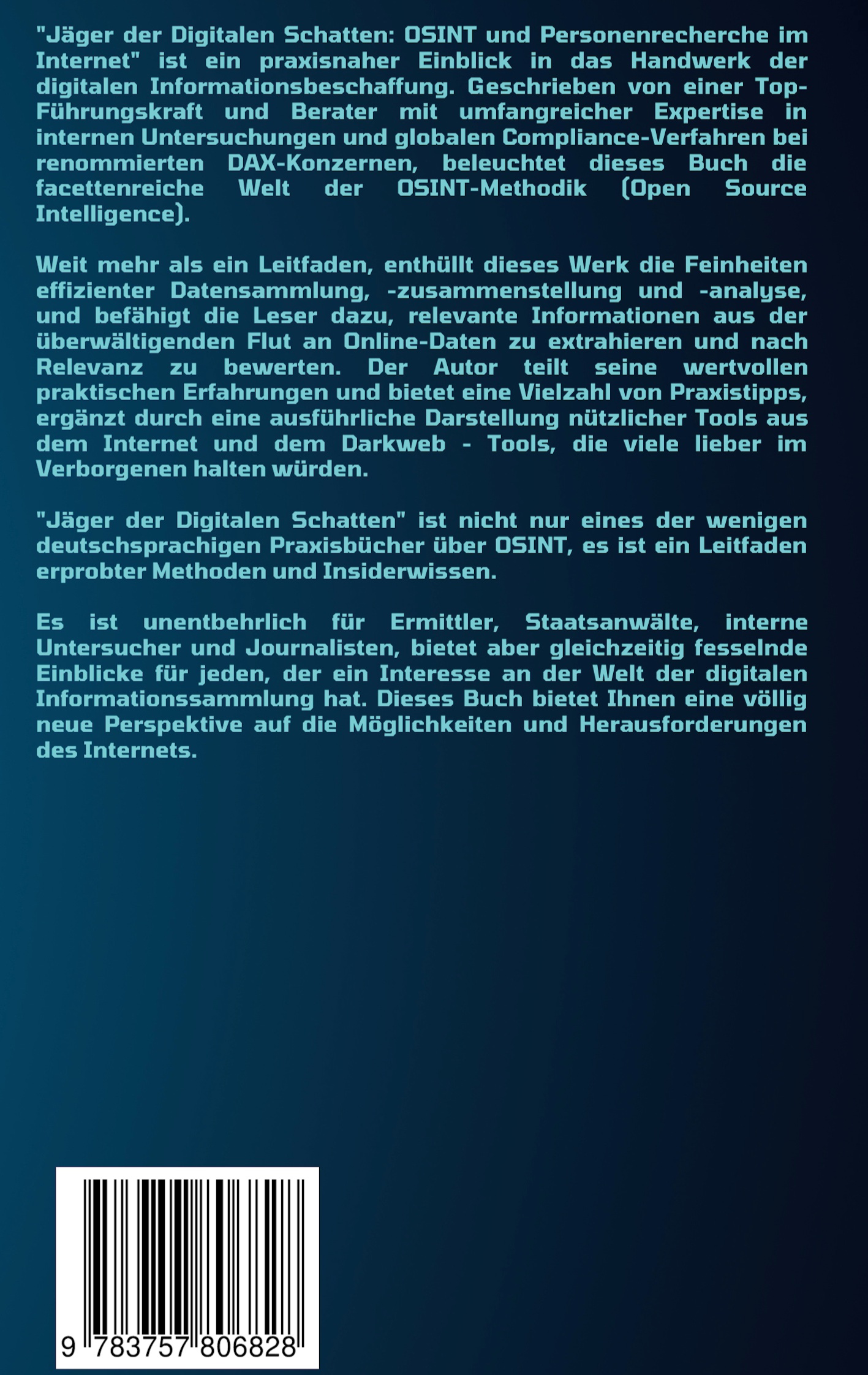 "Jäger der Digitalen Schatten: OSINT und Personenrecherche im Internet" ist ein praxisnaher Einblick in das Handwerk der digitalen Informationsbeschaffung. Geschrieben von einer Top-Führungskraft und Berater mit umfangreicher Expertise in internen Untersuchungen und globalen Compliance-Verfahren bei renommierten DAX-Konzernen, beleuchtet dieses Buch die facettenreiche Welt der OSINT-Methodik (Open Source Intelligence).Weit mehr als ein Leitfaden, enthüllt dieses Werk die Feinheiten effizienter Datensammlung, -zusammenstellung und -analyse, und befähigt die Leser dazu, relevante Informationen aus der überwältigenden Flut an Online-Daten zu extrahieren und nach Relevanz zu bewerten. Der Autor teilt seine wertvollen praktischen Erfahrungen und bietet eine Vielzahl von Praxistipps, ergänzt durch eine ausführliche Darstellung nützlicher Tools aus dem Internet und dem Darkweb - Tools, die viele lieber im Verborgenen halten würden."Jäger der Digitalen Schatten" ist nicht nur eines der wenigen deutschsprachigen Praxisbücher über OSINT, es ist ein Leitfaden erprobter Methoden und Insiderwissen. Es ist unentbehrlich für Ermittler, Staatsanwälte, interne Untersucher und Journalisten, bietet aber gleichzeitig fesselnde Einblicke für jeden, der ein Interesse an der Welt der digitalen Informationssammlung hat. Dieses Buch bietet Ihnen eine völlig neue Perspektive auf die Möglichkeiten und Herausforderungen des Internets.