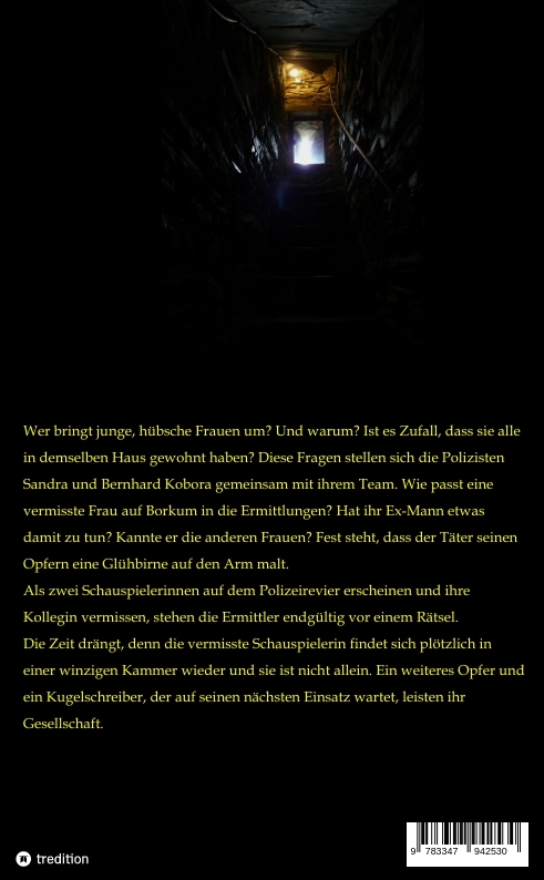 Wer bringt junge, hübsche Frauen um? Und warum? Ist es Zufall, dass sie alle in demselben Haus gewohnt haben? Diese Fragen stellen sich die Polizisten Sandra und Bernhard Kobora gemeinsam mit ihrem Team. Wie passt eine vermisste Frau auf Borkum in die Ermittlungen? Hat ihr Ex-Mann etwas damit zu tun? Kannte er die anderen Frauen? Fest steht, dass der Täter seinen Opfern eine Glühbirne auf den Arm malt. Als zwei Schauspielerinnen auf dem Polizeirevier erscheinen und ihre Kollegin vermissen, stehen die Ermittler endgültig vor einem Rätsel. Die Zeit drängt, denn die vermisste Schauspielerin findet sich plötzlich in einer winzigen Kammer wieder und sie ist nicht allein. Ein weiteres Opfer und ein Kugelschreiber, der auf seinen nächsten Einsatz wartet, leisten ihr Gesellschaft.